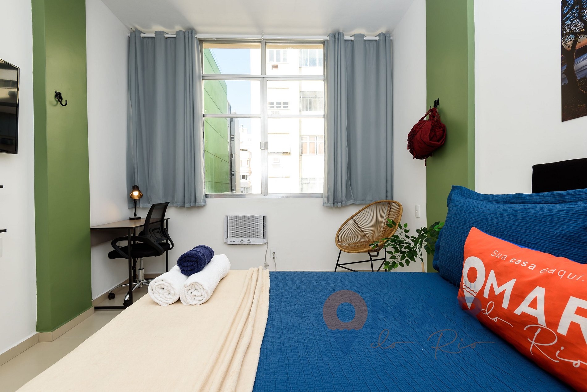 Estudio: cama doble estándar (188cm x 138cm), aire acondicionado, smart TV con canales en abierto, escritorio y silla para trabajar, armario con perchas, zona de lectura con silla Acapulco, hamaca y cortina blackout.