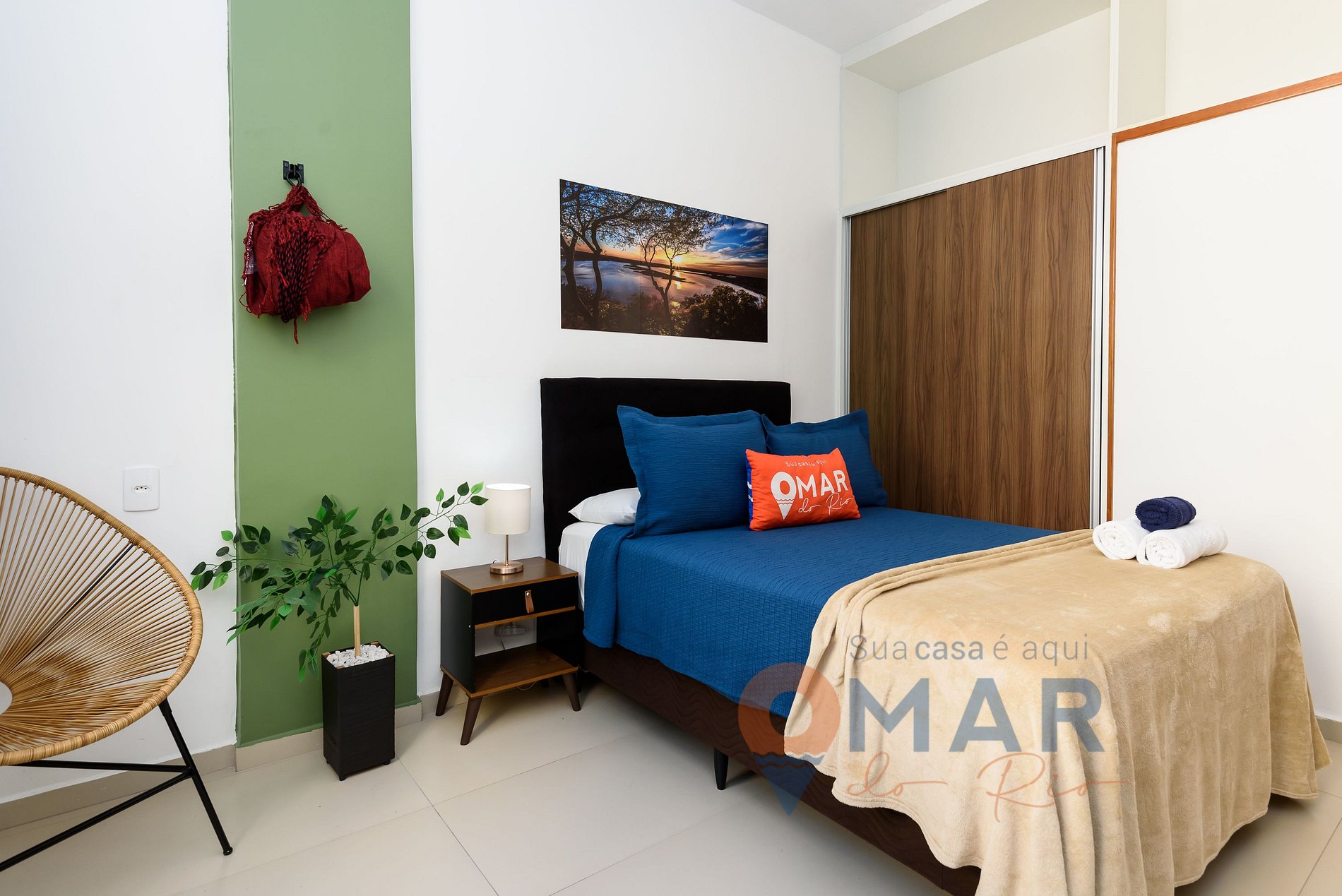 Estudio: cama doble estándar (188cm x 138cm), aire acondicionado, smart TV con canales en abierto, escritorio y silla para trabajar, armario con perchas, zona de lectura con silla Acapulco, hamaca y cortina blackout.
