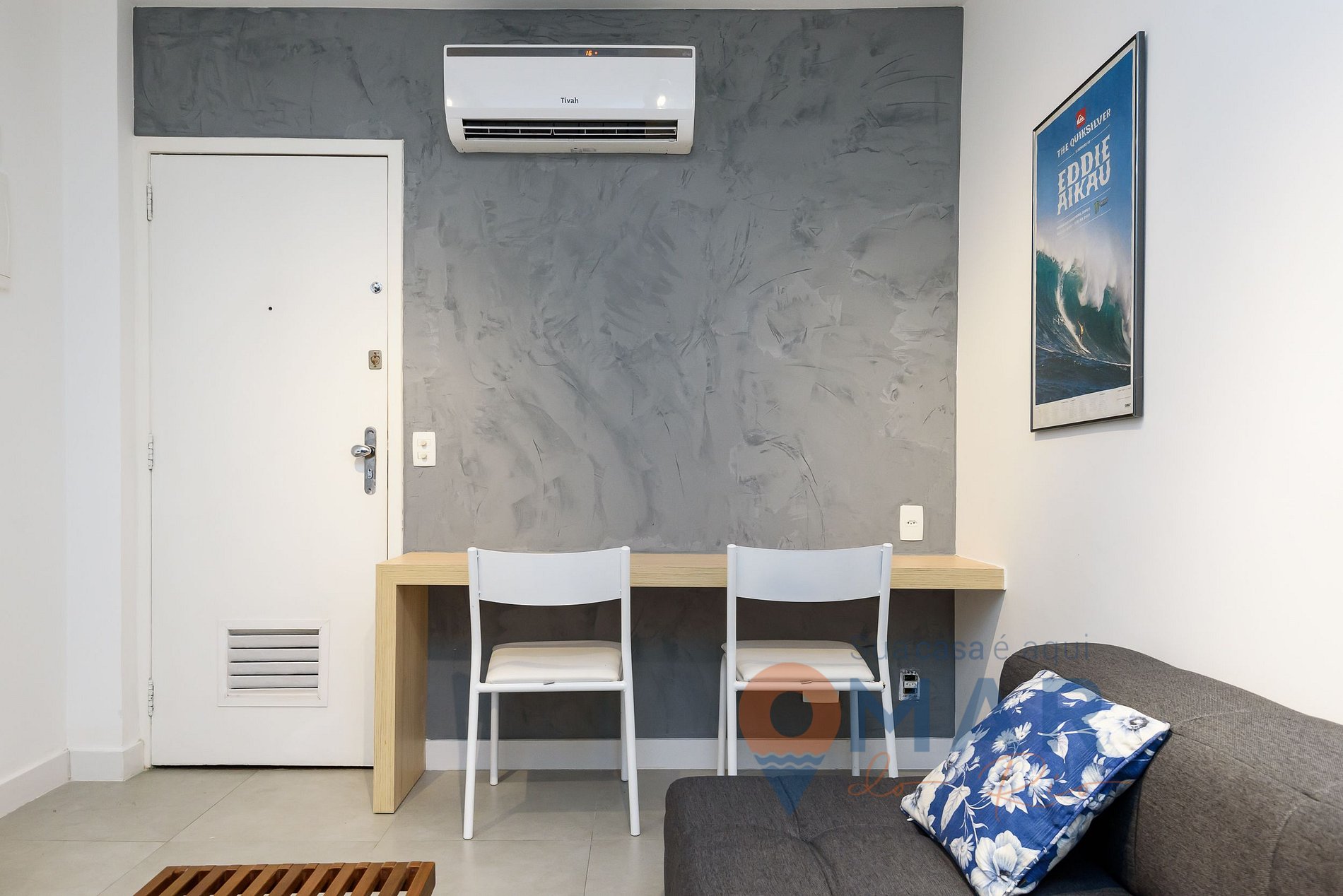 Salón: Sofá cama, aire acondicionado split, cortina, banco con asientos, Smart TV y Alexa Echo Dot.