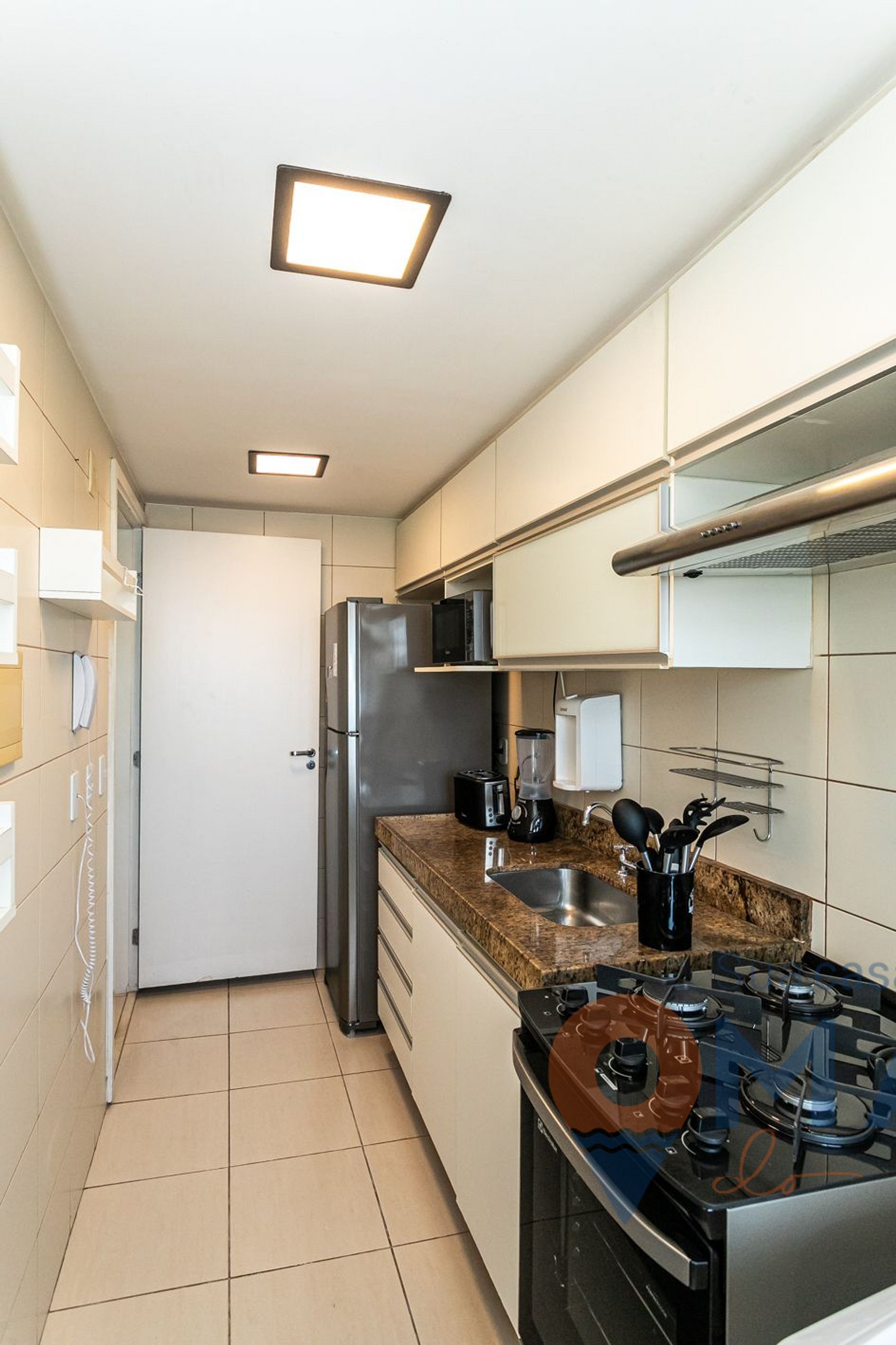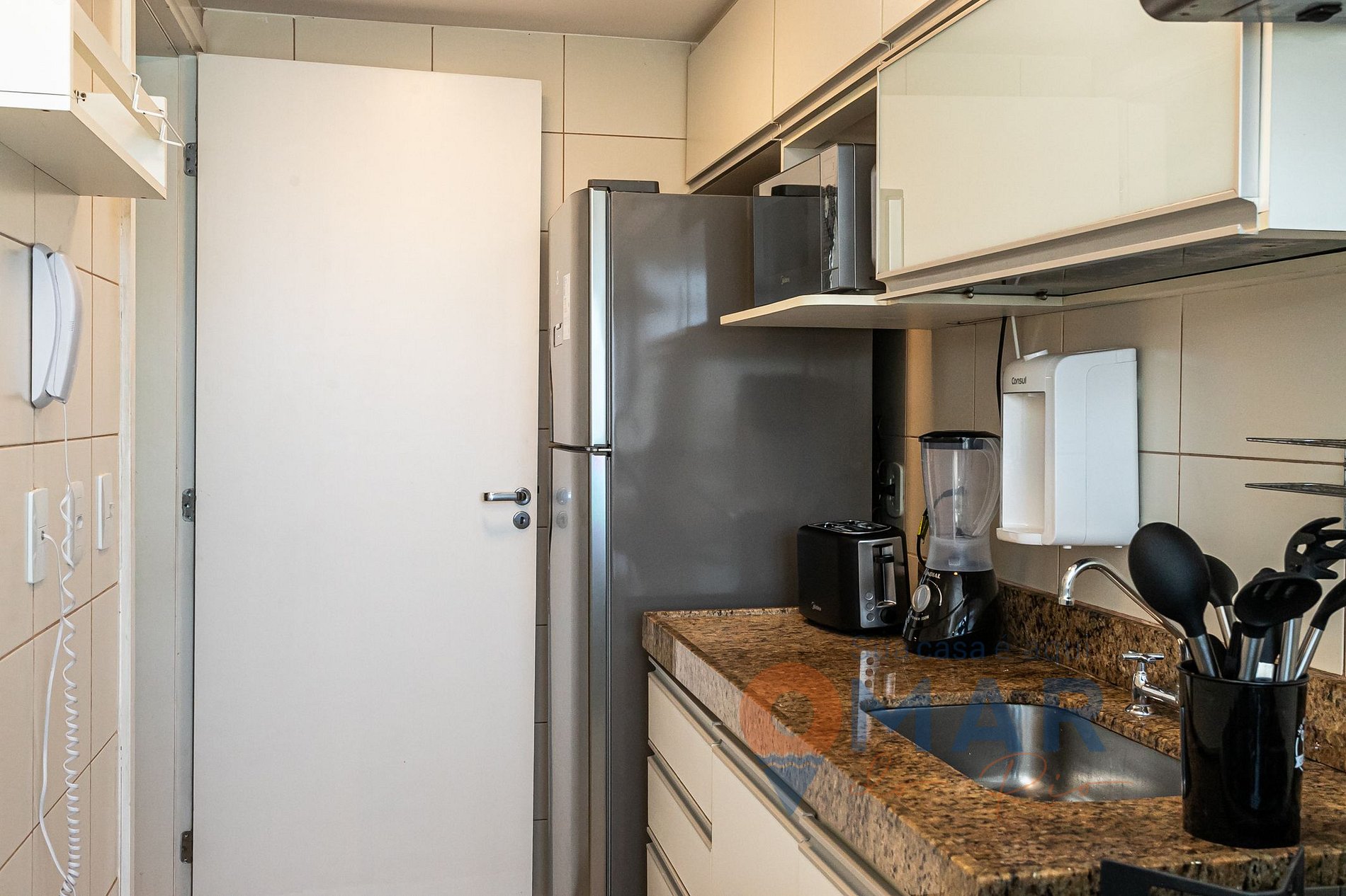 Cocina: cocina, nevera, microondas, cafetera, batidora, purificador de agua, cuencos y utensilios de cocina.