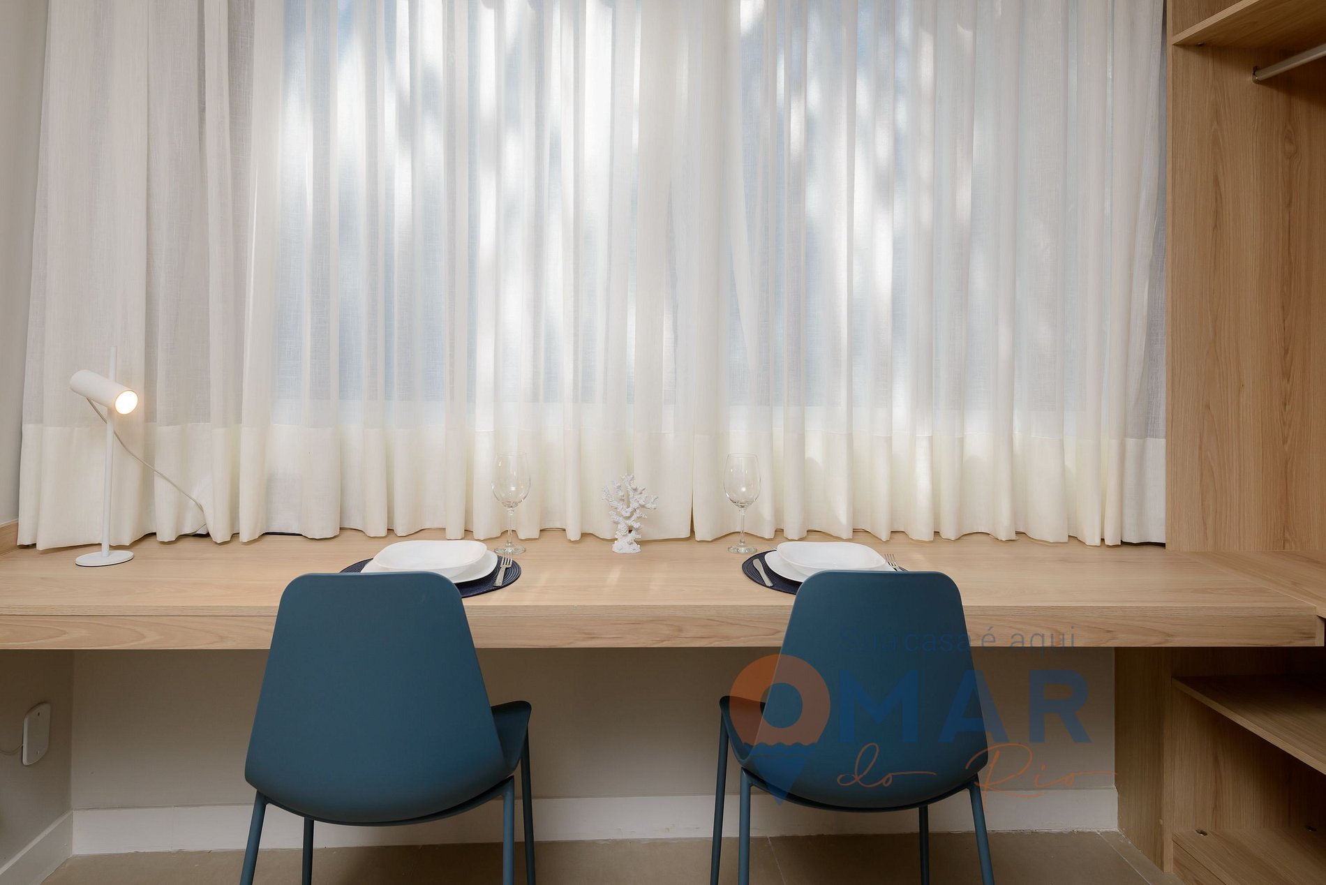 Estudio: cama queen size (198 cm x 158 cm), smart TV de 43 pulgadas, aire acondicionado split, cortinas translúcidas y opacas, espejo de cuerpo entero, armario con perchas y mesa con sillas de comedor.