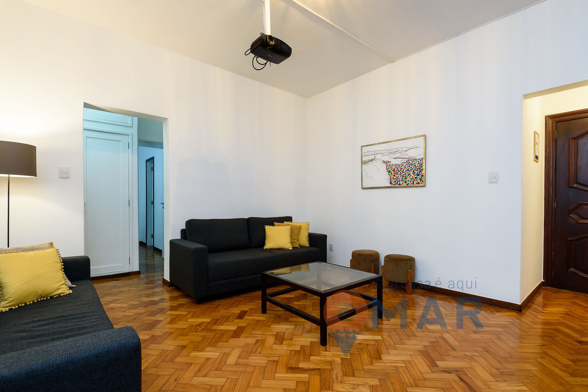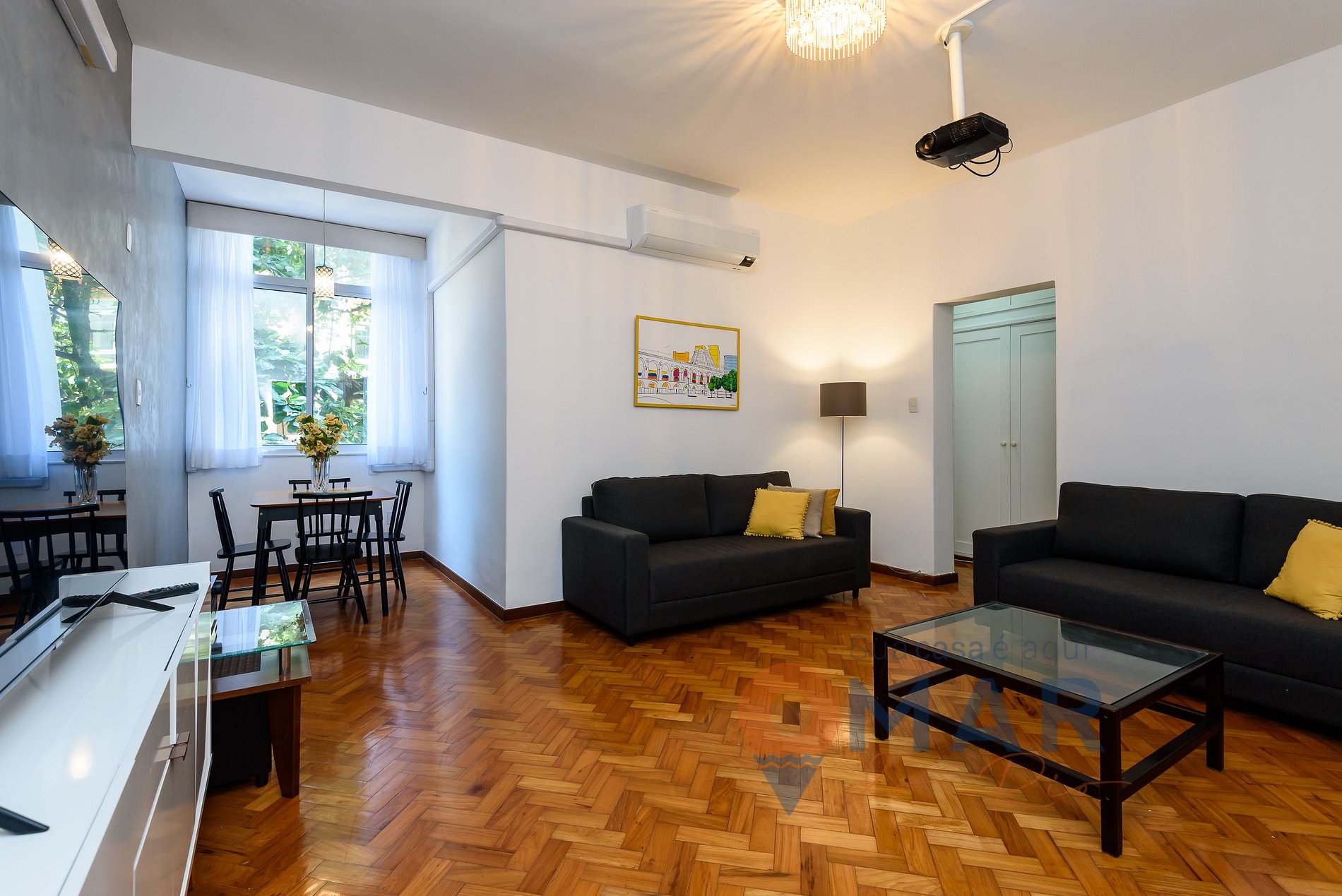 Sala: Proyector con canales por cable, smart TV 60", 2 sofás y mesa de comedor con 4 sillas.