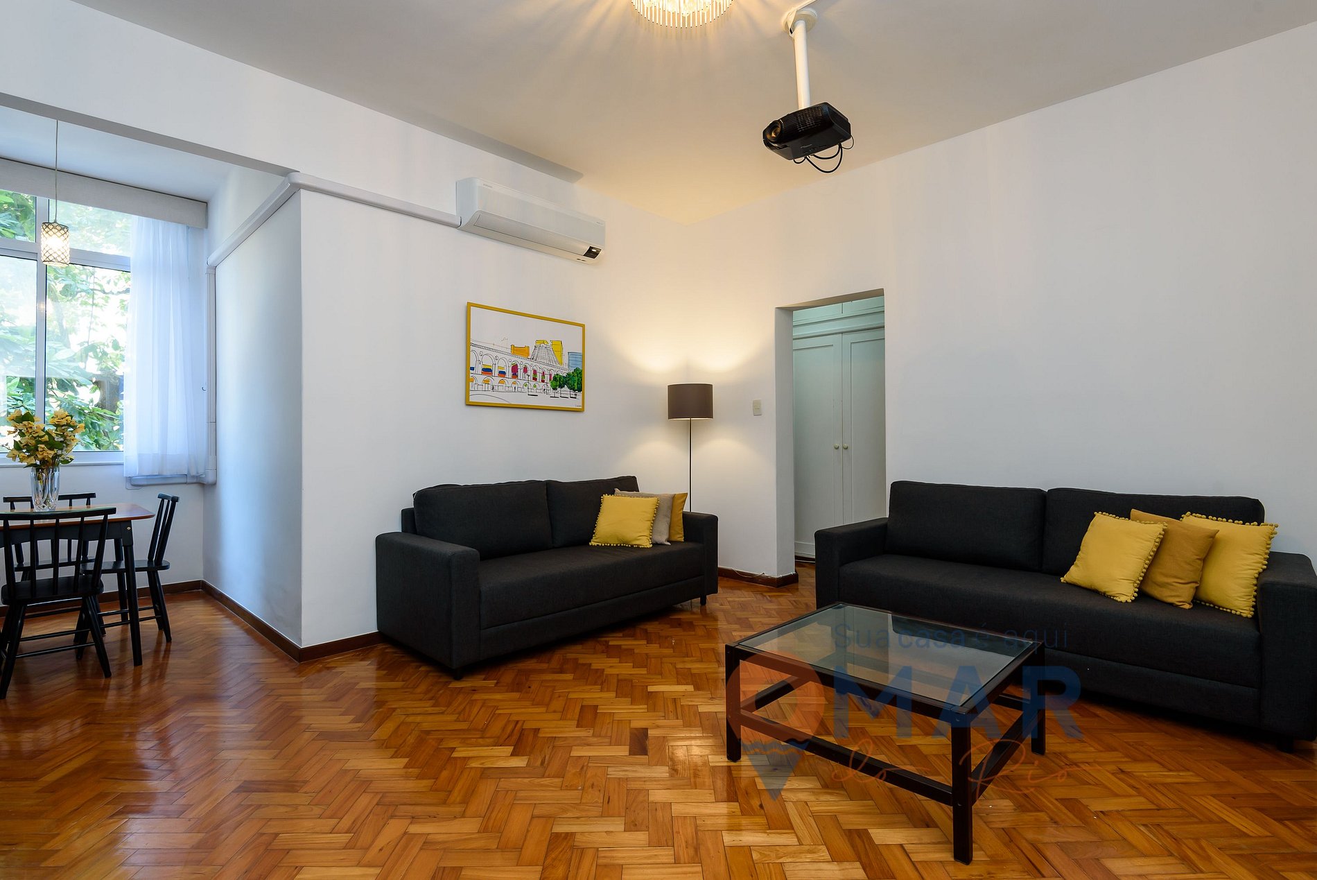 Sala: Proyector con canales por cable, smart TV 60", 2 sofás y mesa de comedor con 4 sillas.