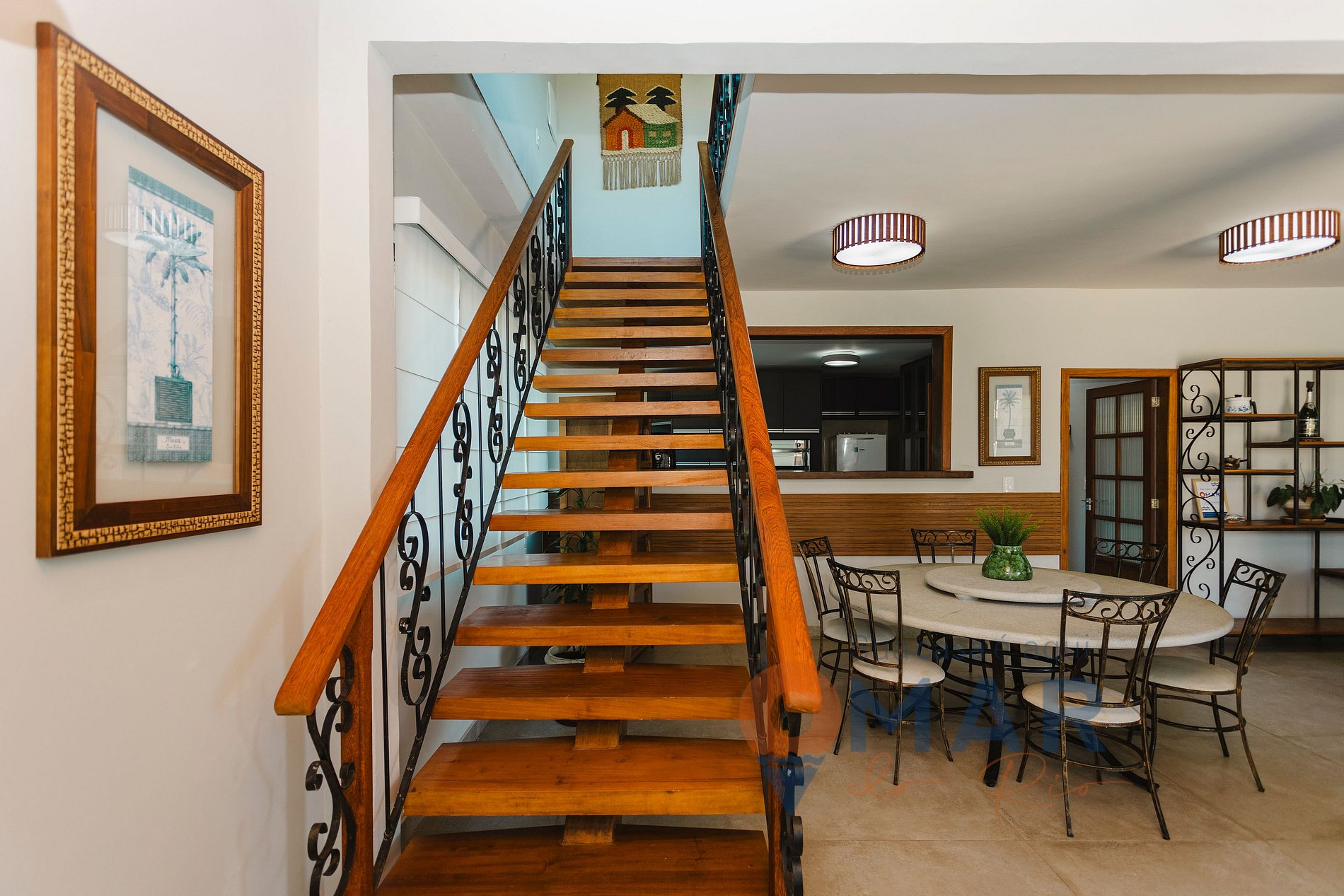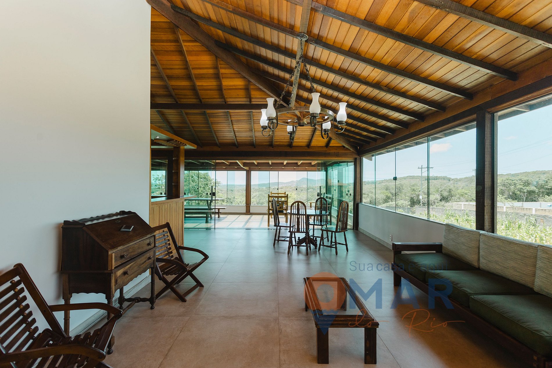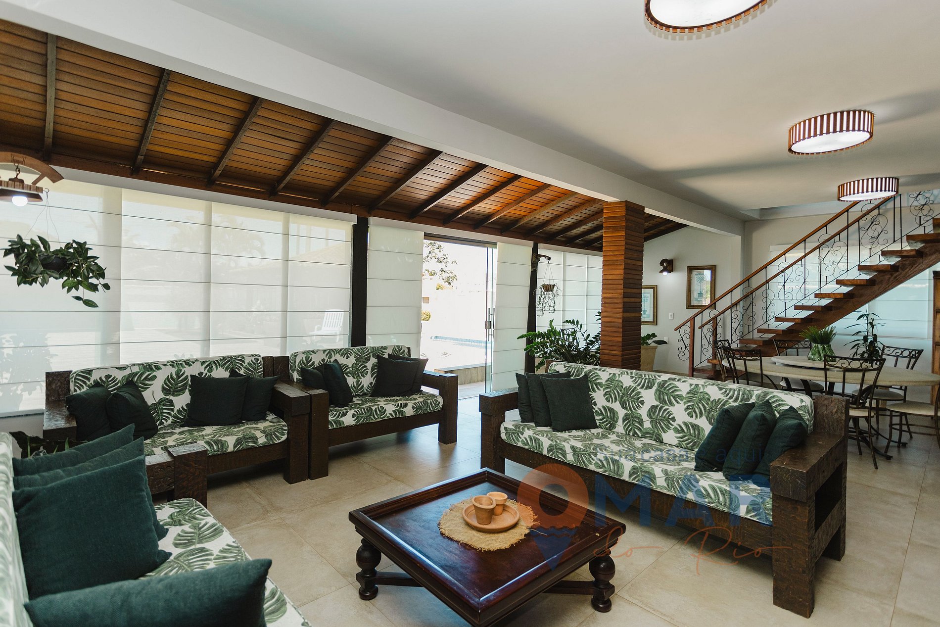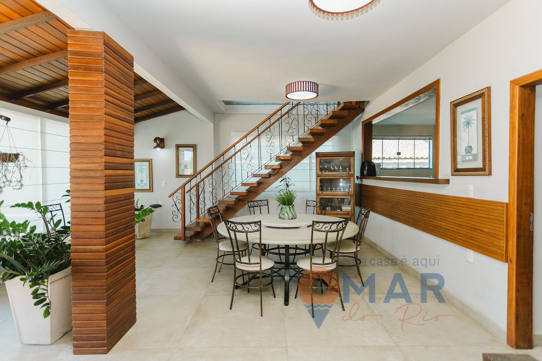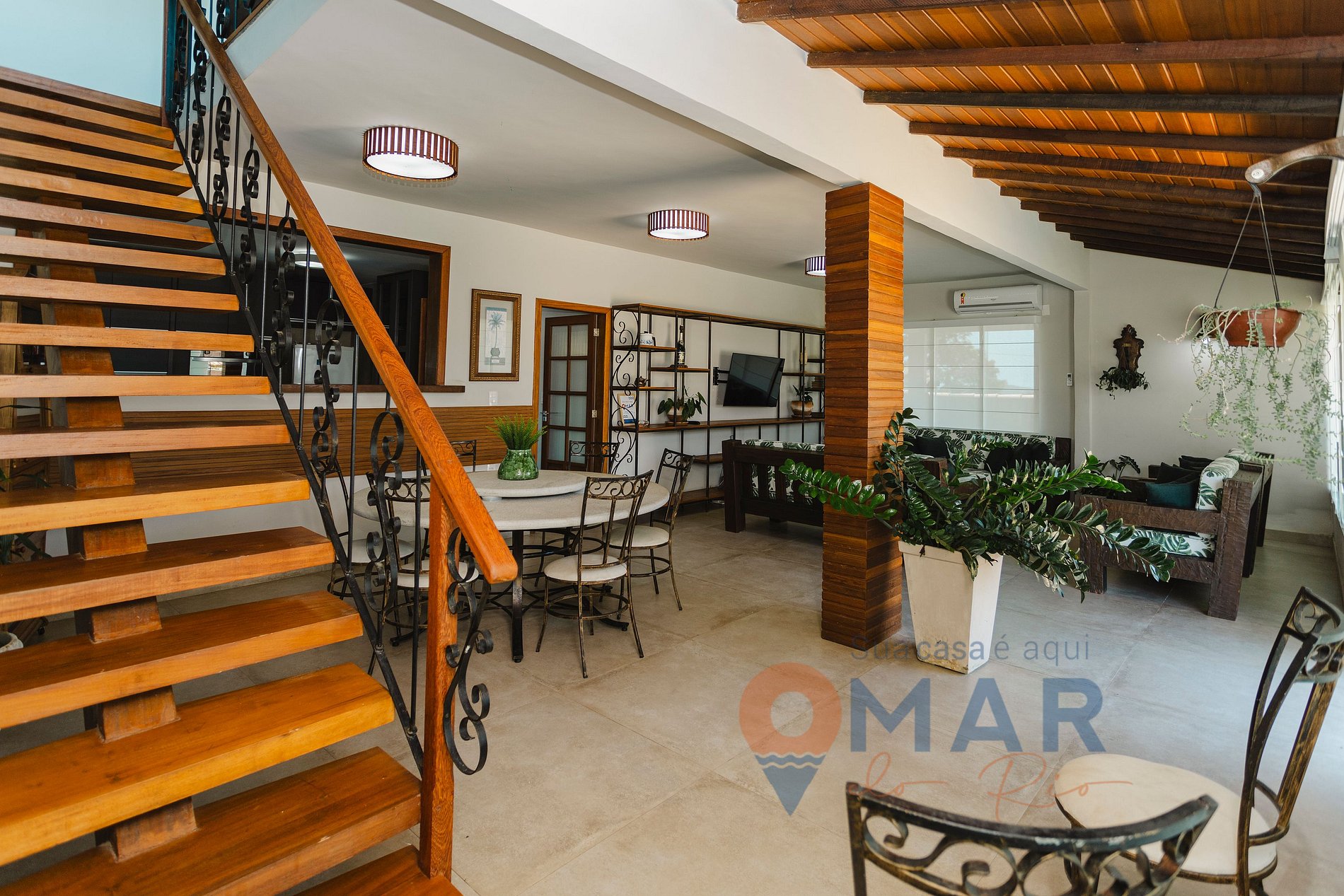 Sala (1º andar): sofá, mesa de jantar, Smart TV 50'', poltronas, mesa e cadeiras.