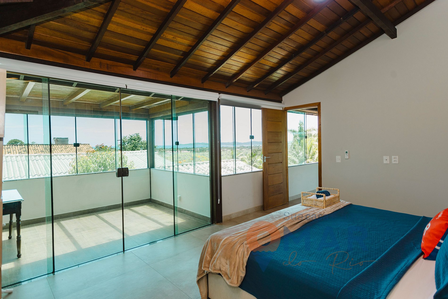 Suíte 1 (2º andar): Cama King Size (203cm x 193cm), ar-condicionado, ventilador, armário e cortina blackout.