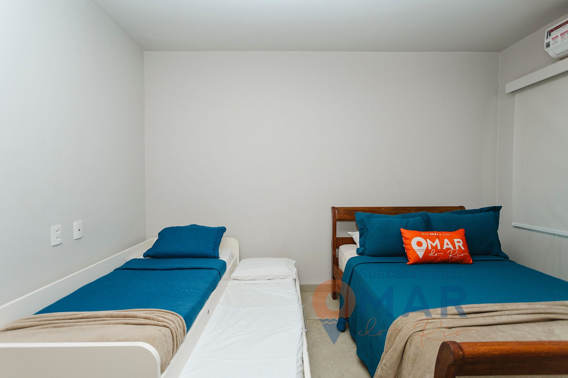 Quarto (1º andar): Cama casal padrão (185cm x 138cm), cama beliche de solteiro (188cm x 88cm) para 2 crianças, ar-condicionado, armário e cortina blackout.