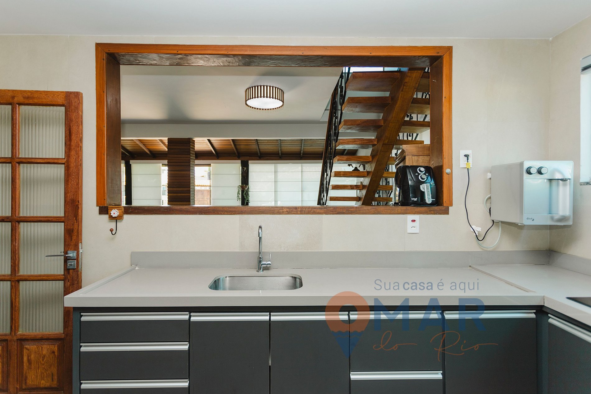 Cozinha (1º andar): Geladeira, fogão 5 bocas com forno, micro-ondas, liquidificador, cafeteira, air fryer e utensílios de cozinha.