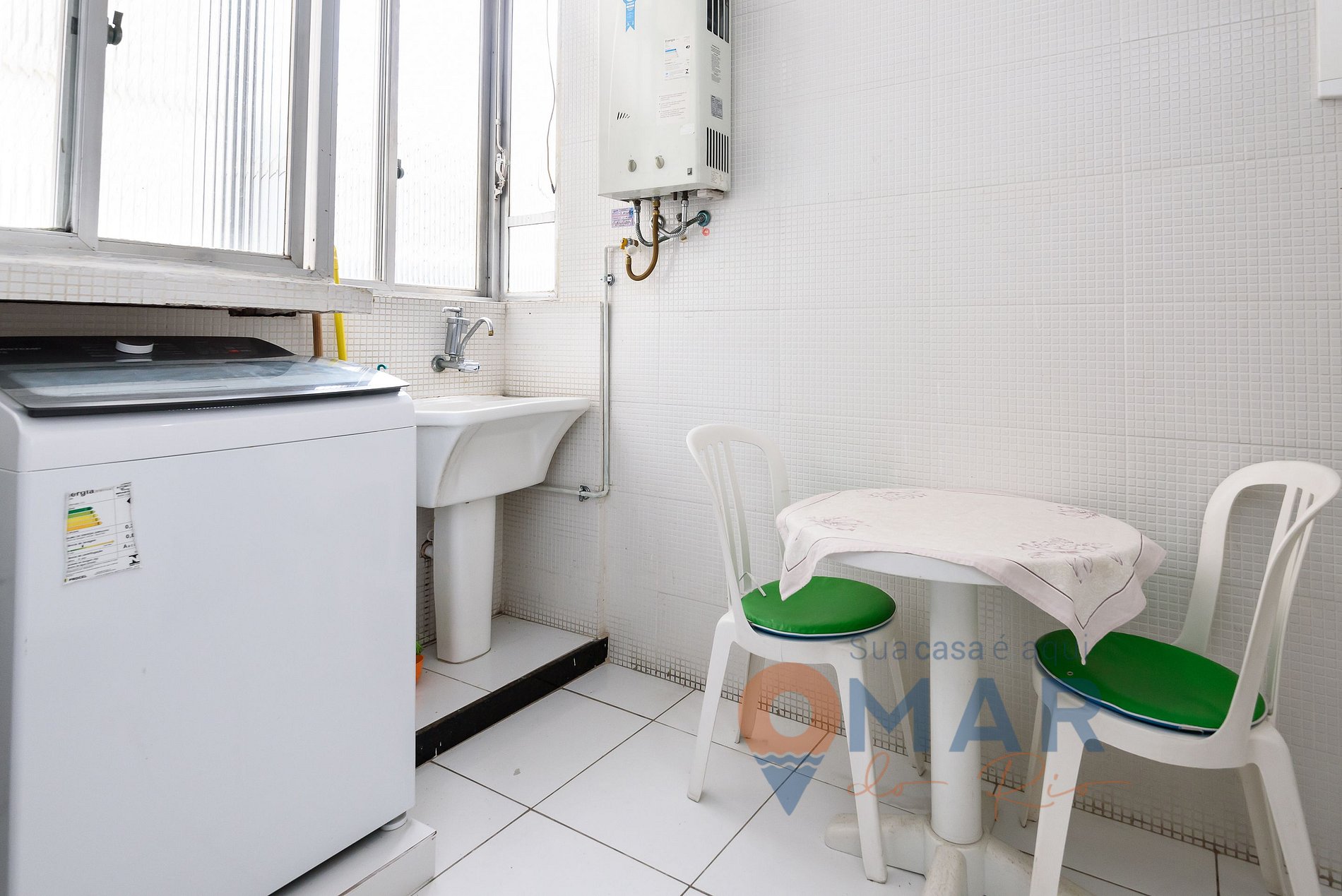 Área de serviço: Máquina de lavar, tanque, ferro de passar roupa e tela de proteção.