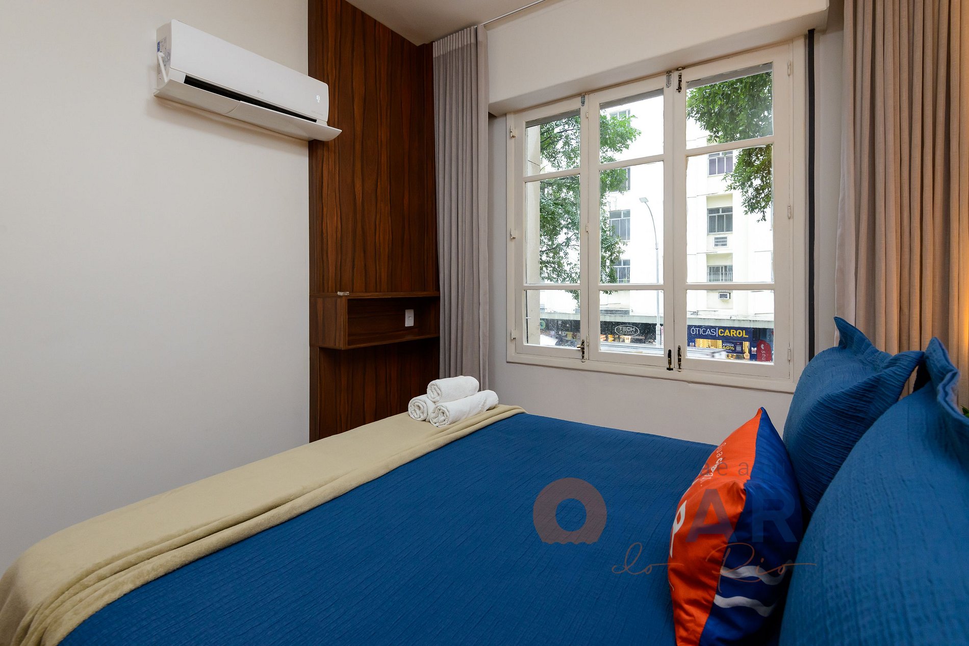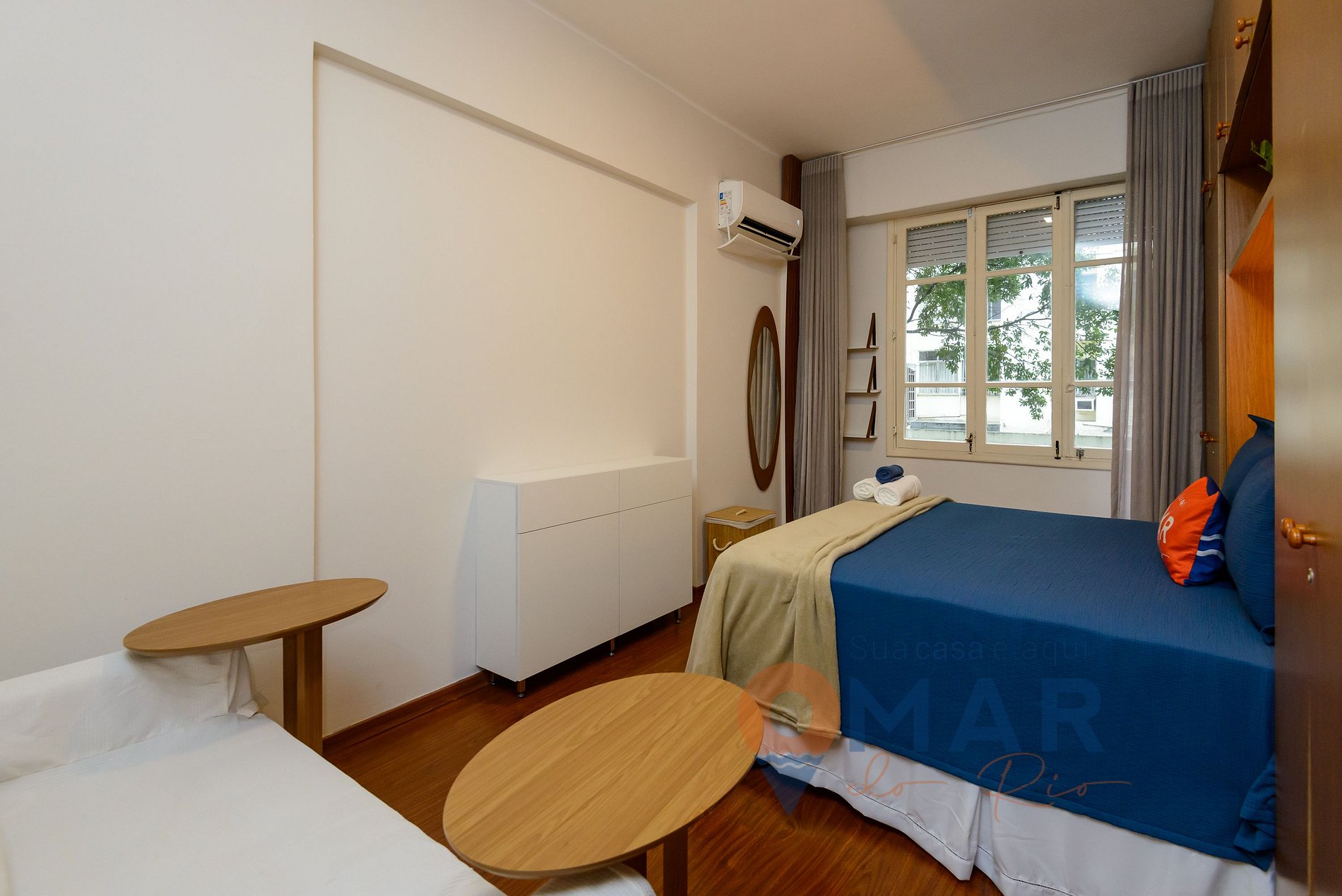 Quarto 1: cama queen size (198cm x 158cm), sofá, ar-condicionado split, armário com cabides, espelho de corpo inteiro, cortina translúcida e veneziana externa.