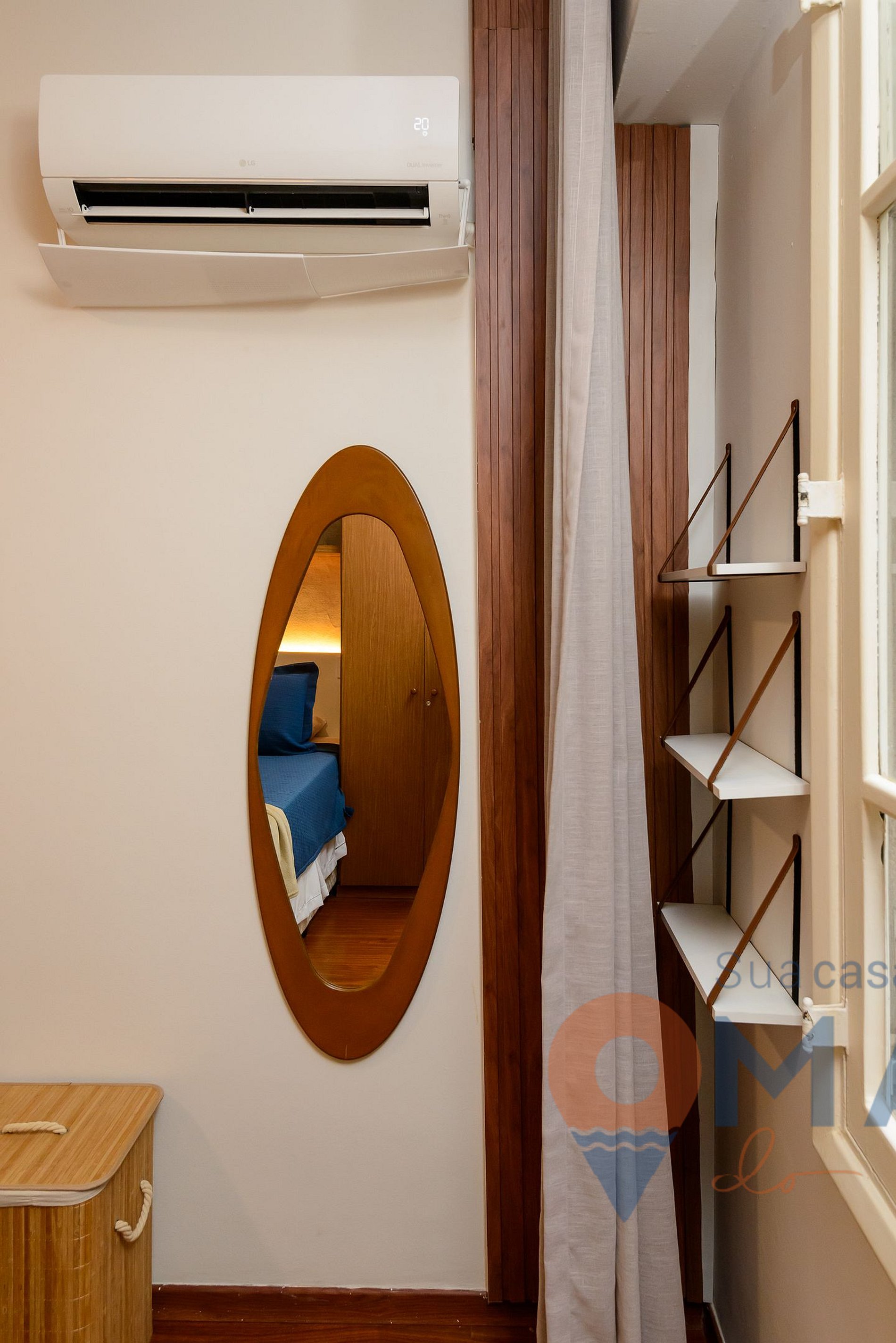 Suíte: cama queen size (198cm x 158cm), ar-condicionado split, arara de roupas com cabides e prateleiras, espelho de corpo inteiro, cortina translúcida e veneziana externa.