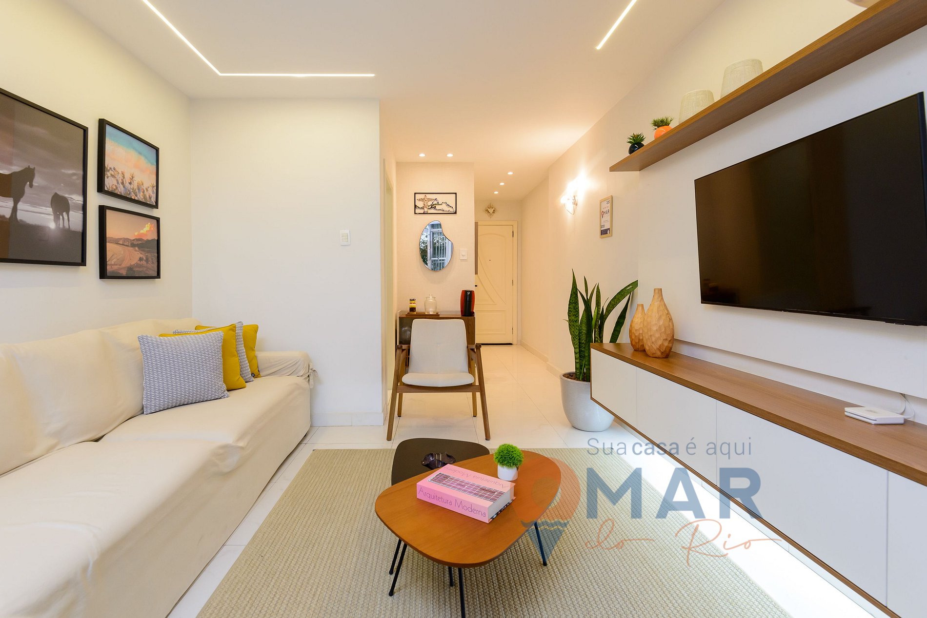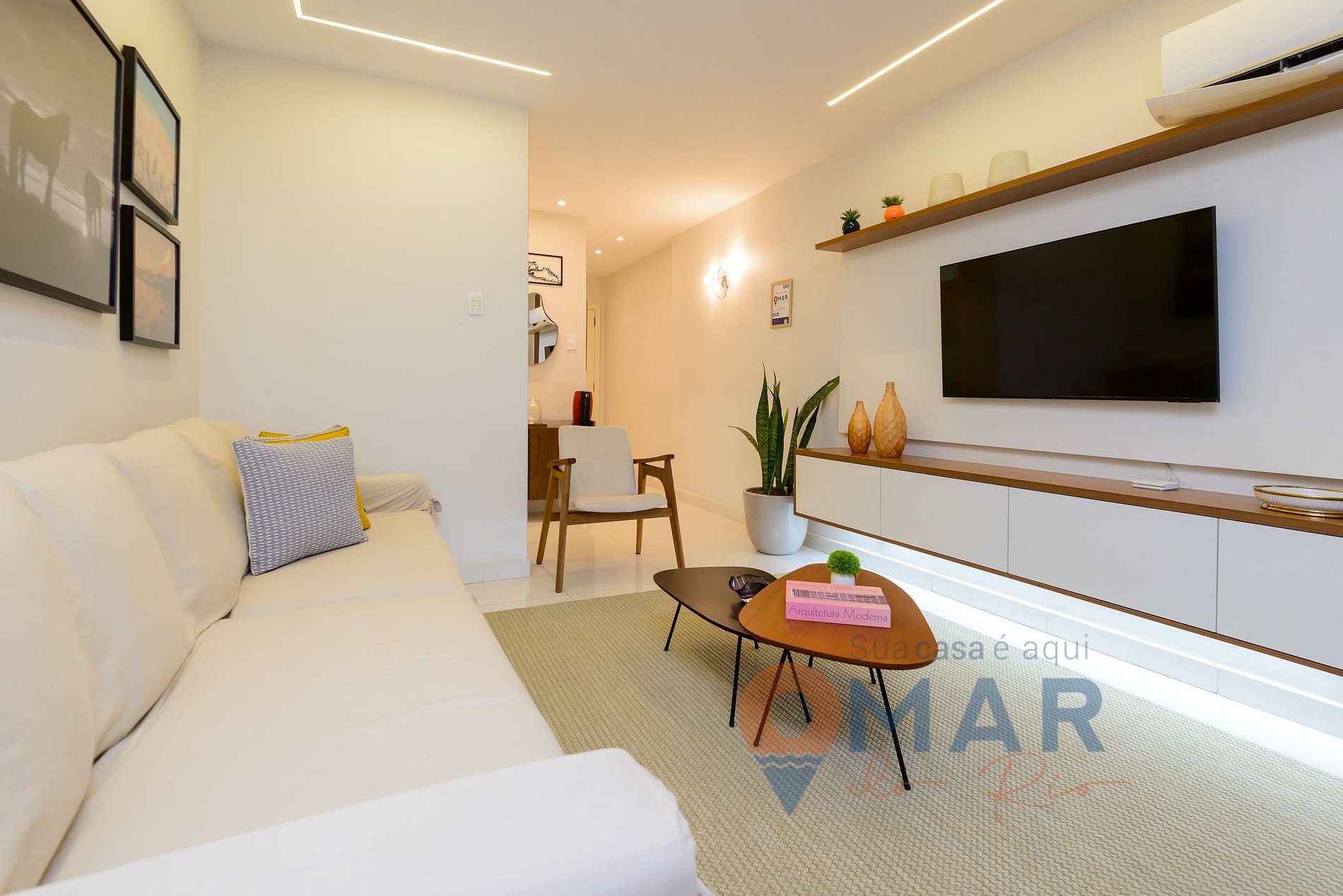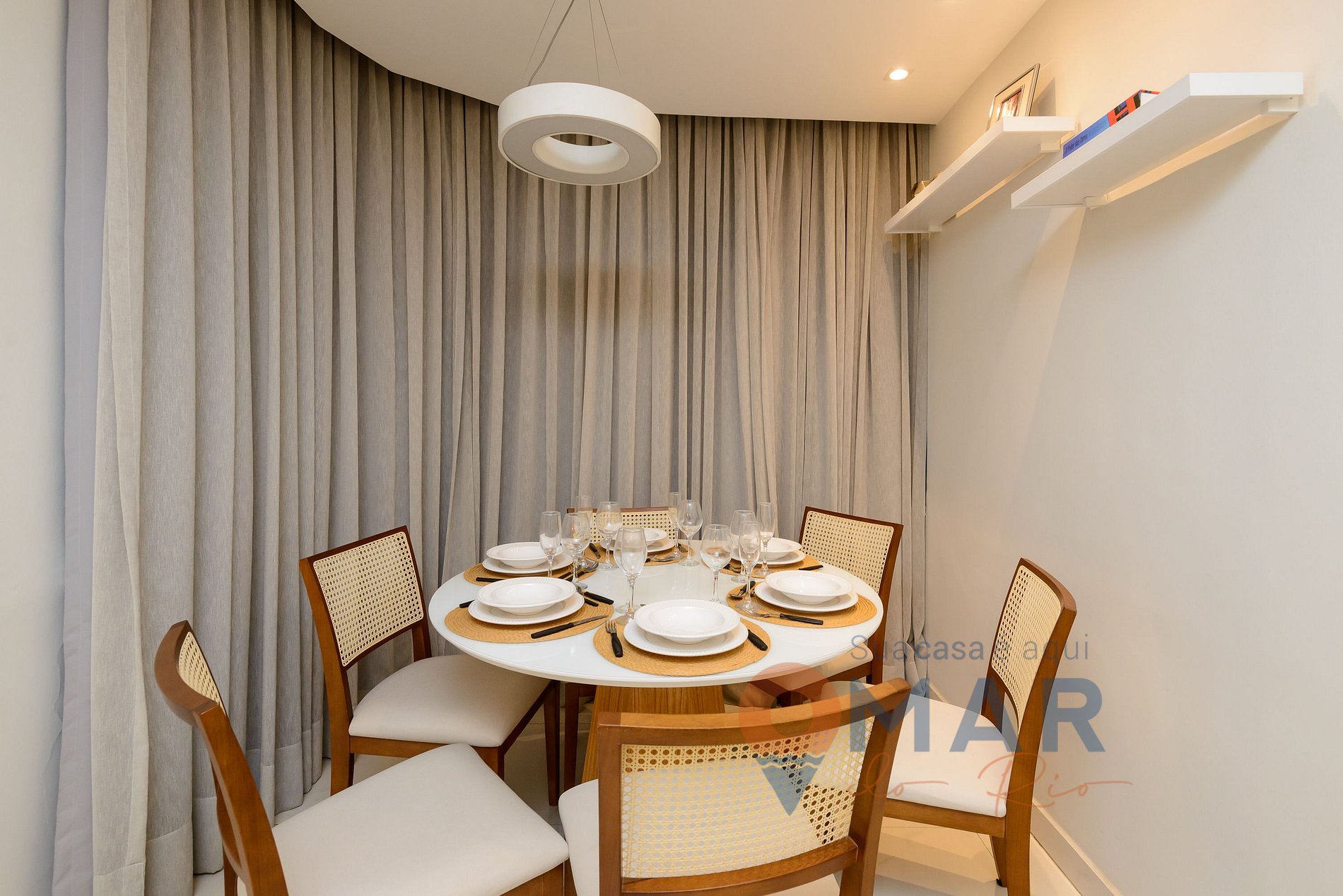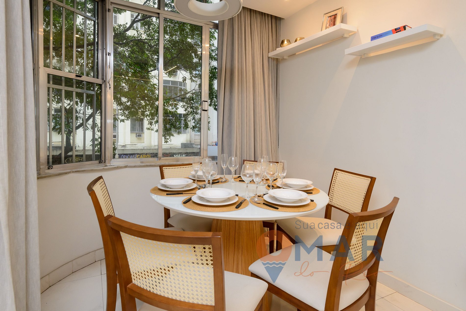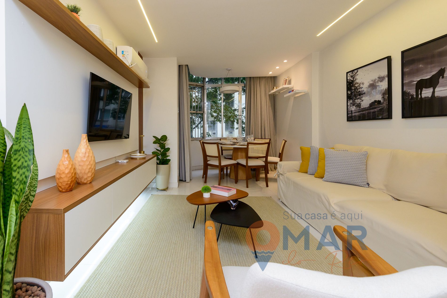 Sala: sofá, smart TV 50" com btv e canais a cabo, ar-condicionado split, poltrona, mesa de jantar com cadeiras, cortina blackout.