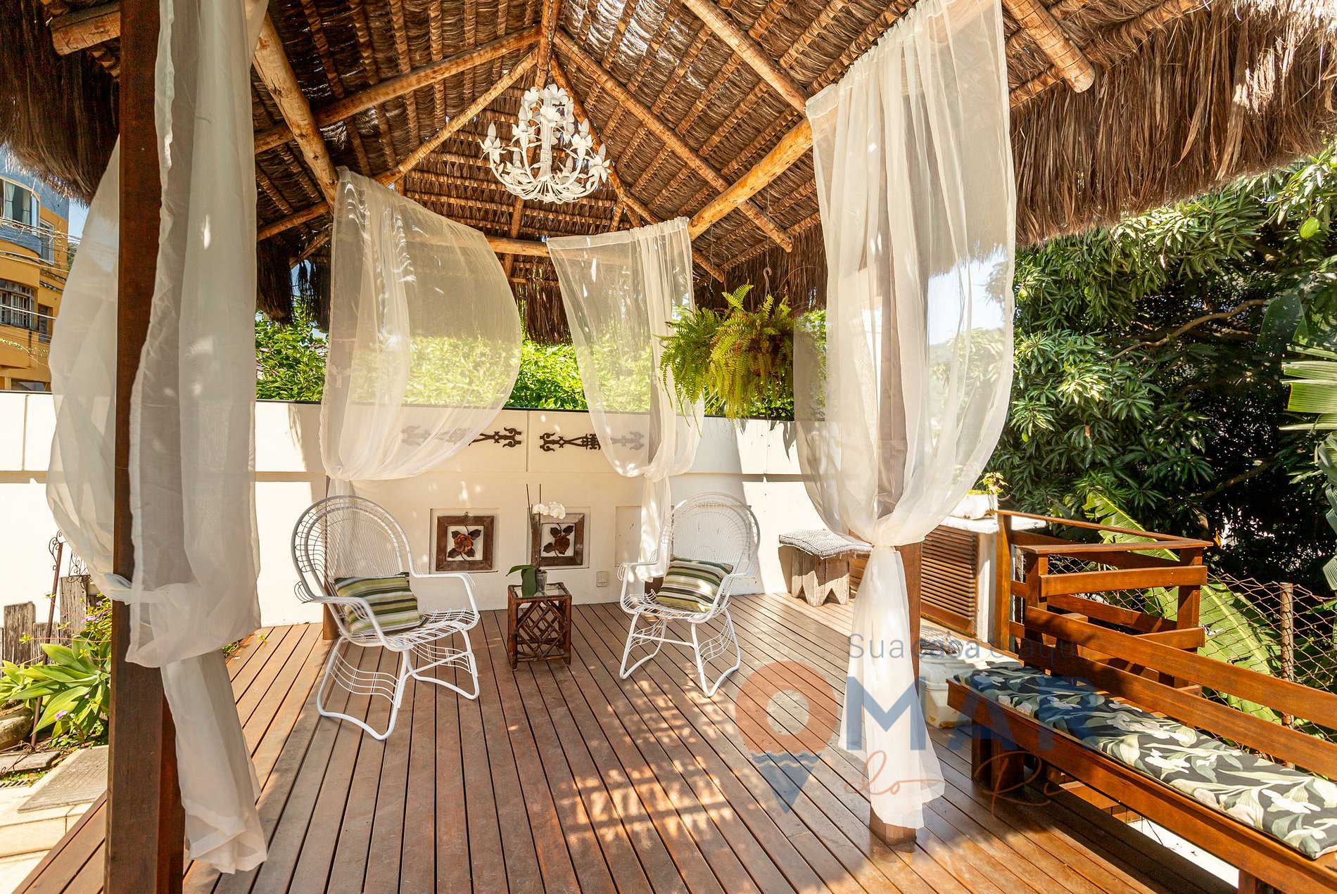 Varanda (2º andar): rede de descanso, poltronas e vista para piscina.