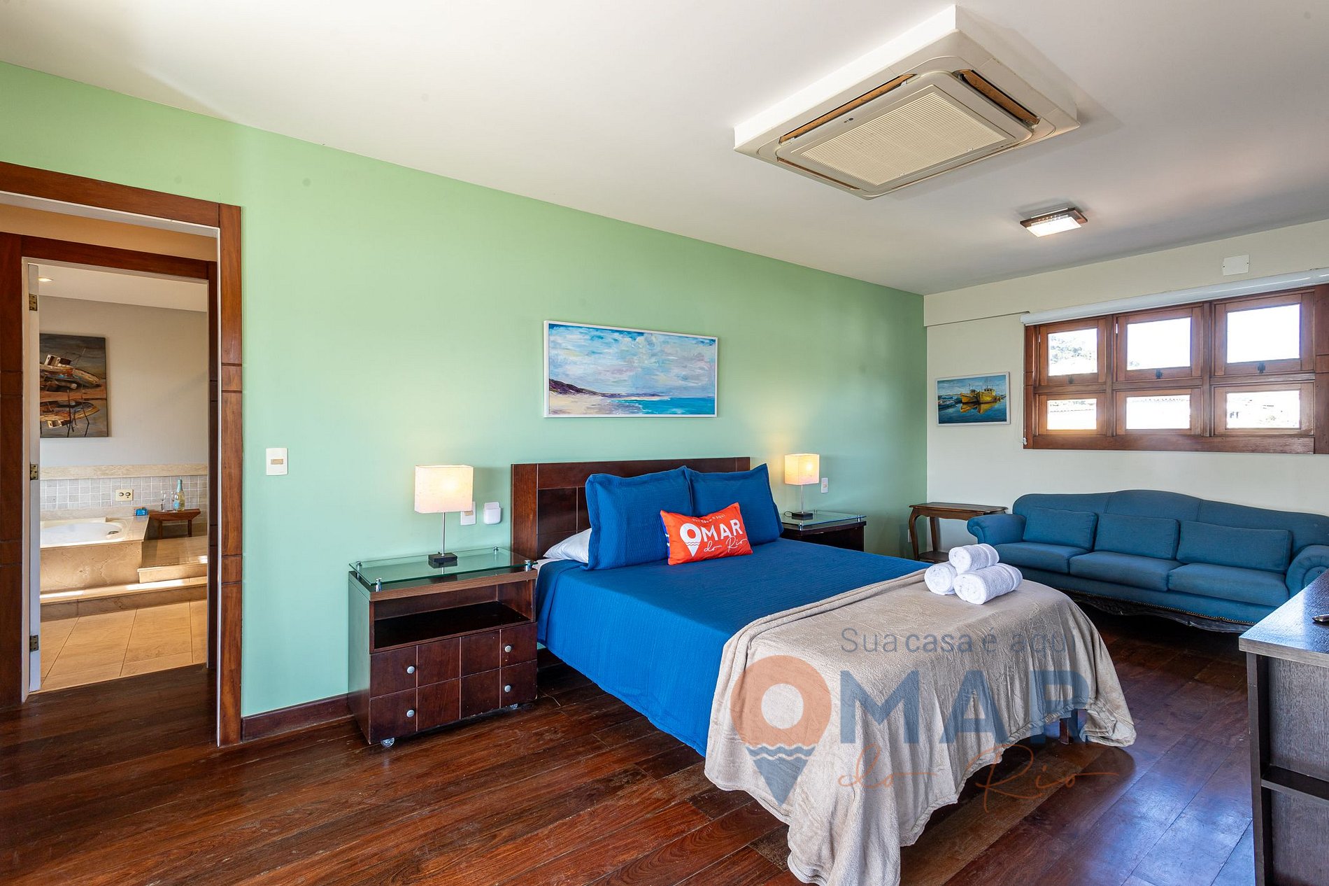 Suíte Master (3º andar): king size (203cm x 193cm), TV com canais abertos, ar-condicionado central, sofá, arara com cabides, cortina blackout e banheira de hidromassagem.