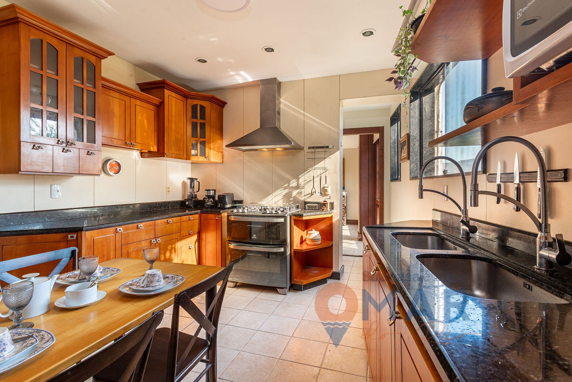 Outros: 2 banheiros sociais (1 com banheira de hidromassagem), máquina de lavar 12kg, secadora 10kg, varal de secar roupas, ferro e tábua de passar, aspirador de pó e secador de cabelo.