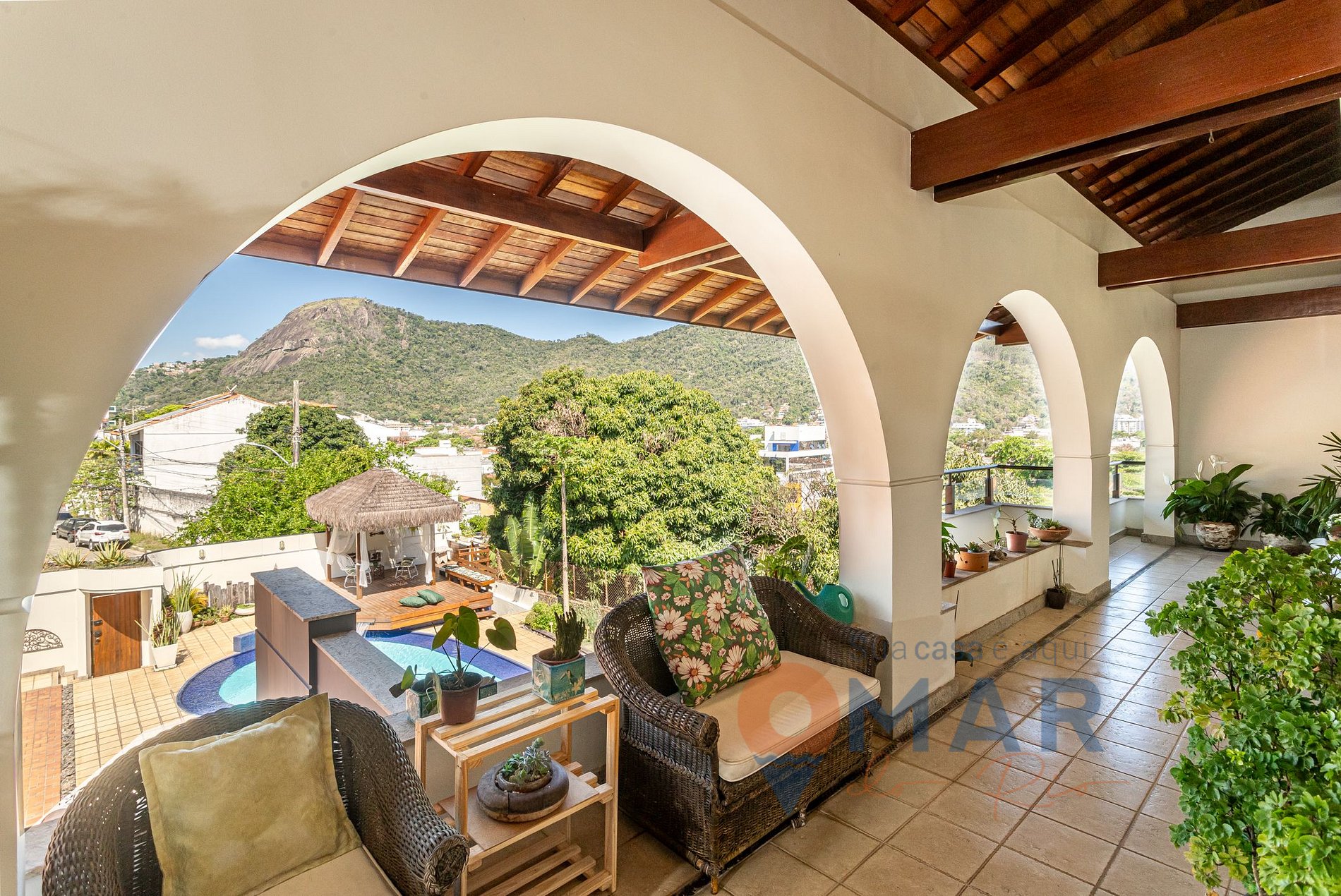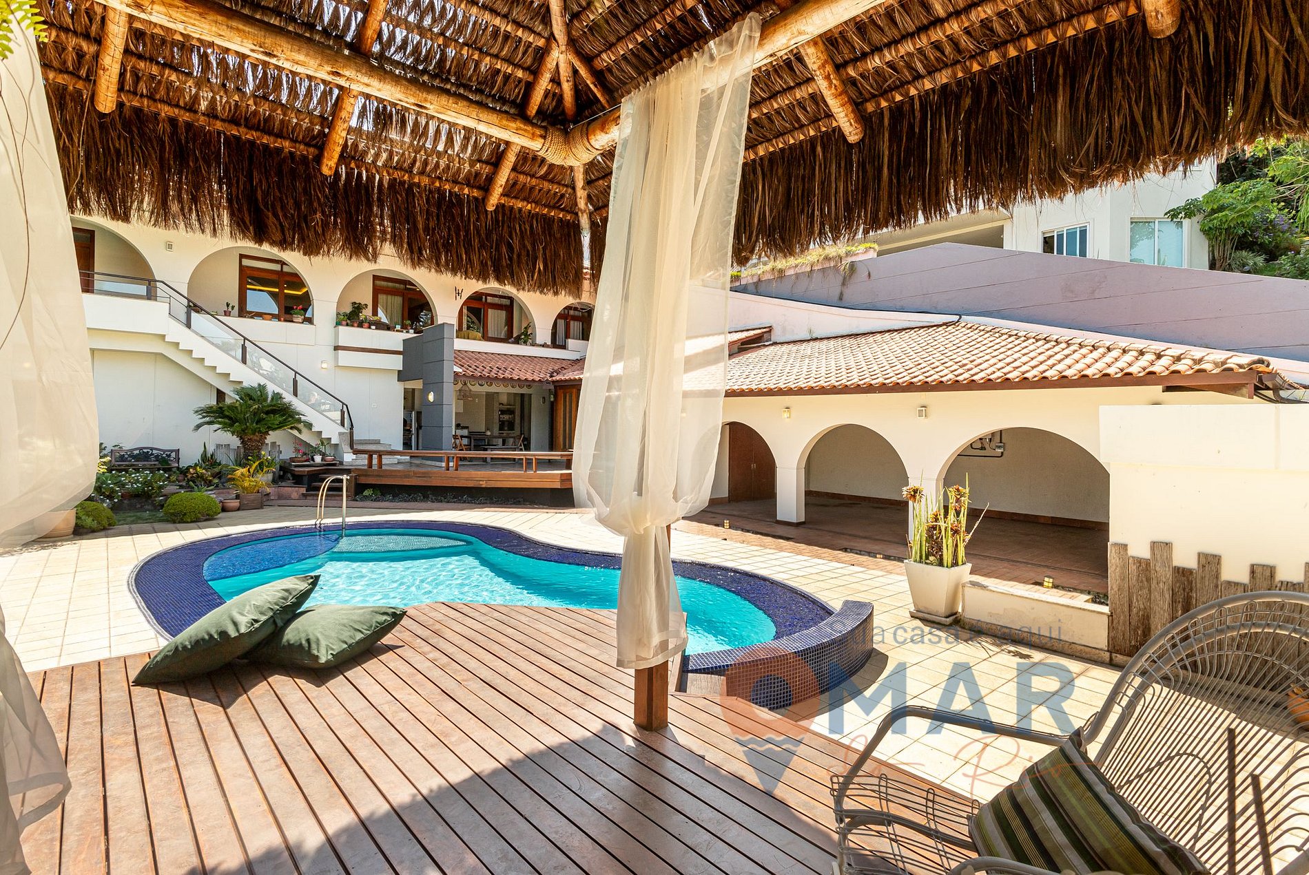 Varanda (2º andar): rede de descanso, poltronas e vista para piscina.
