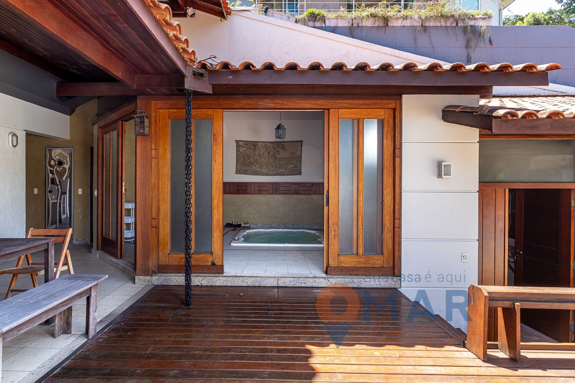 Outros: 2 banheiros sociais (1 com banheira de hidromassagem), máquina de lavar 12kg, secadora 10kg, varal de secar roupas, ferro e tábua de passar, aspirador de pó e secador de cabelo.