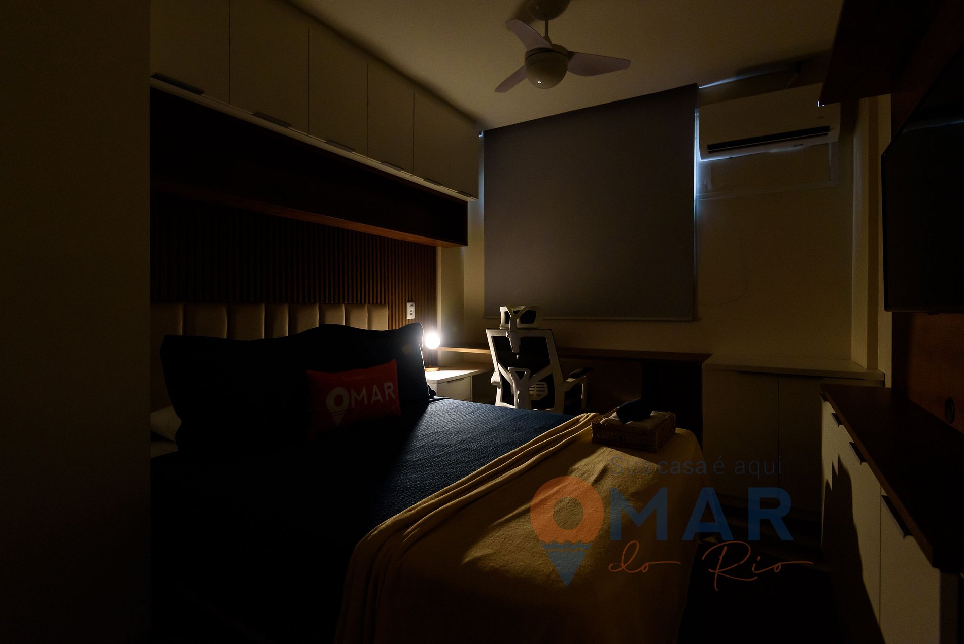 Suíte: cama Queen Size (198cm x 158cm), ar condicionado, Smart TV com canais a cabo, workstation, armário fechado, cortina blackout.