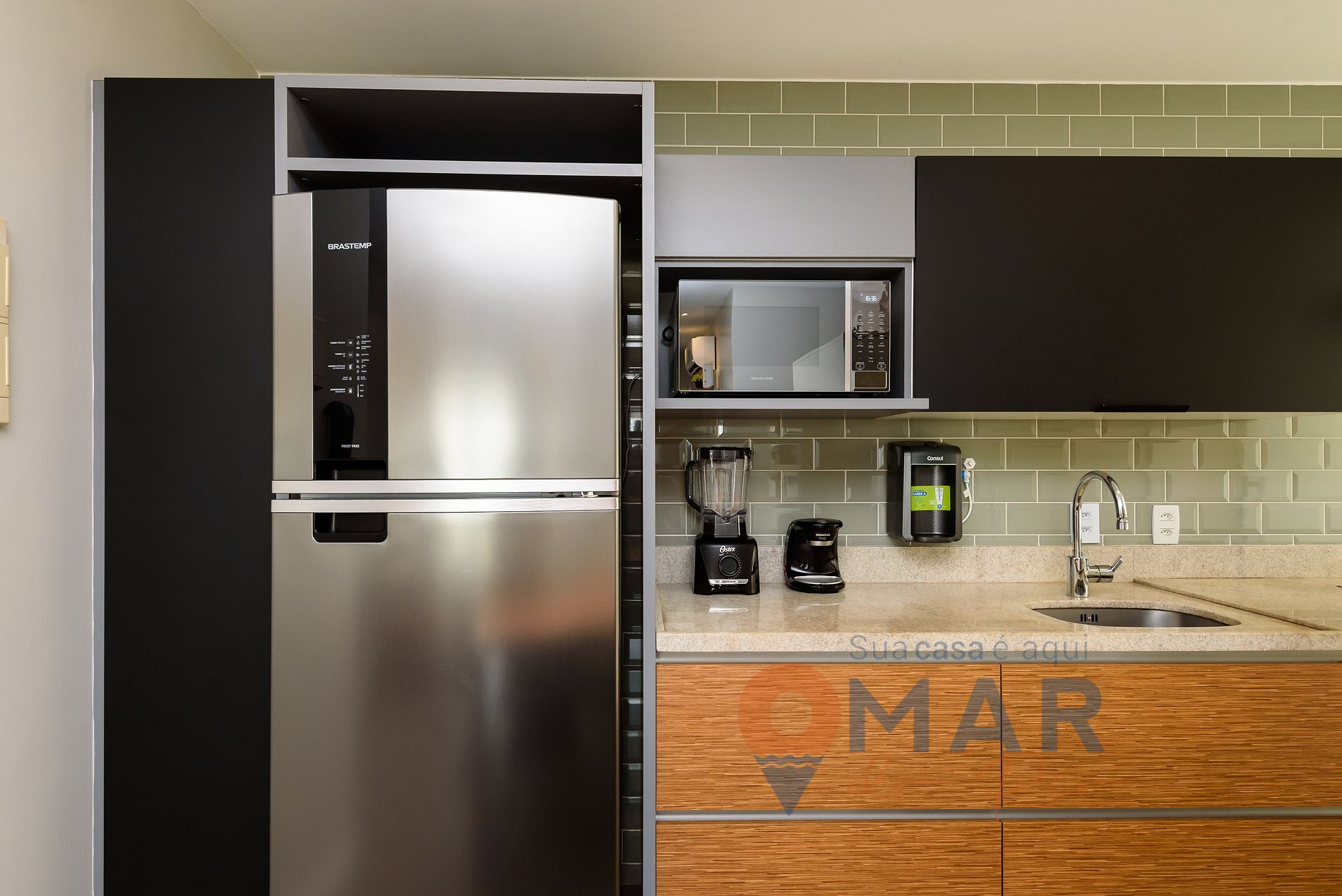 Cozinha: fogão, geladeira, forno, micro-ondas, cafeteira nespresso, liquidificador, purificador de água, utensílios.