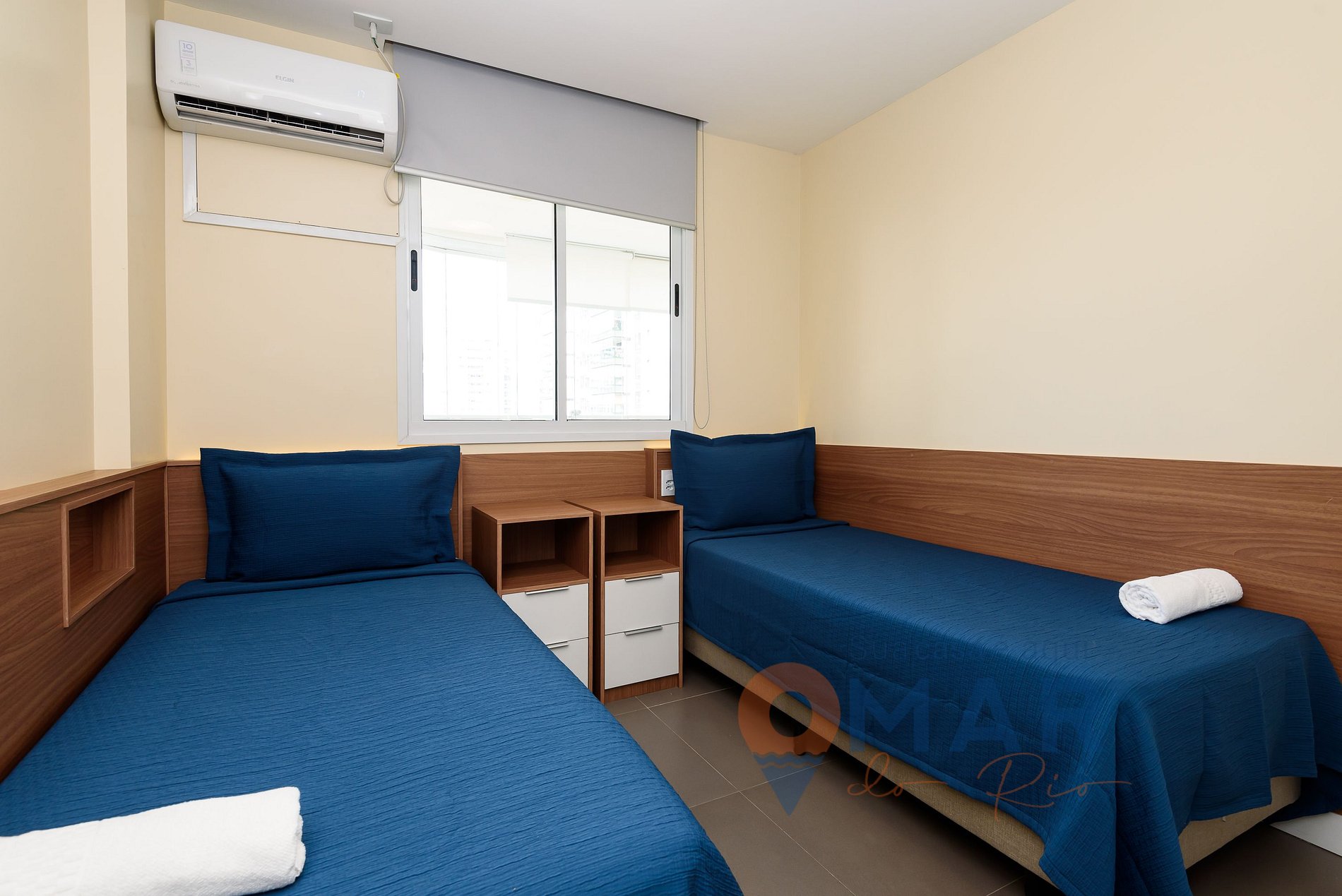 Quarto: 2 camas de solteiro (188cm x 88cm), ar condicionado, armário fechado, cortina blackout.
