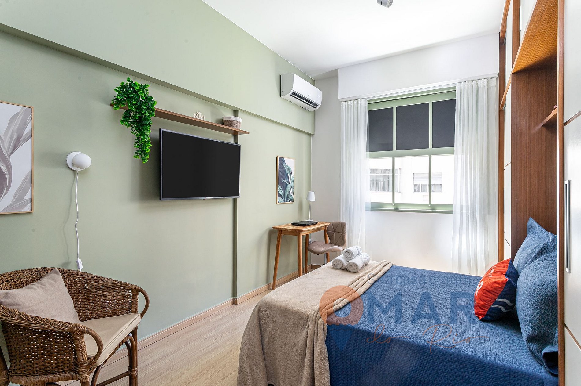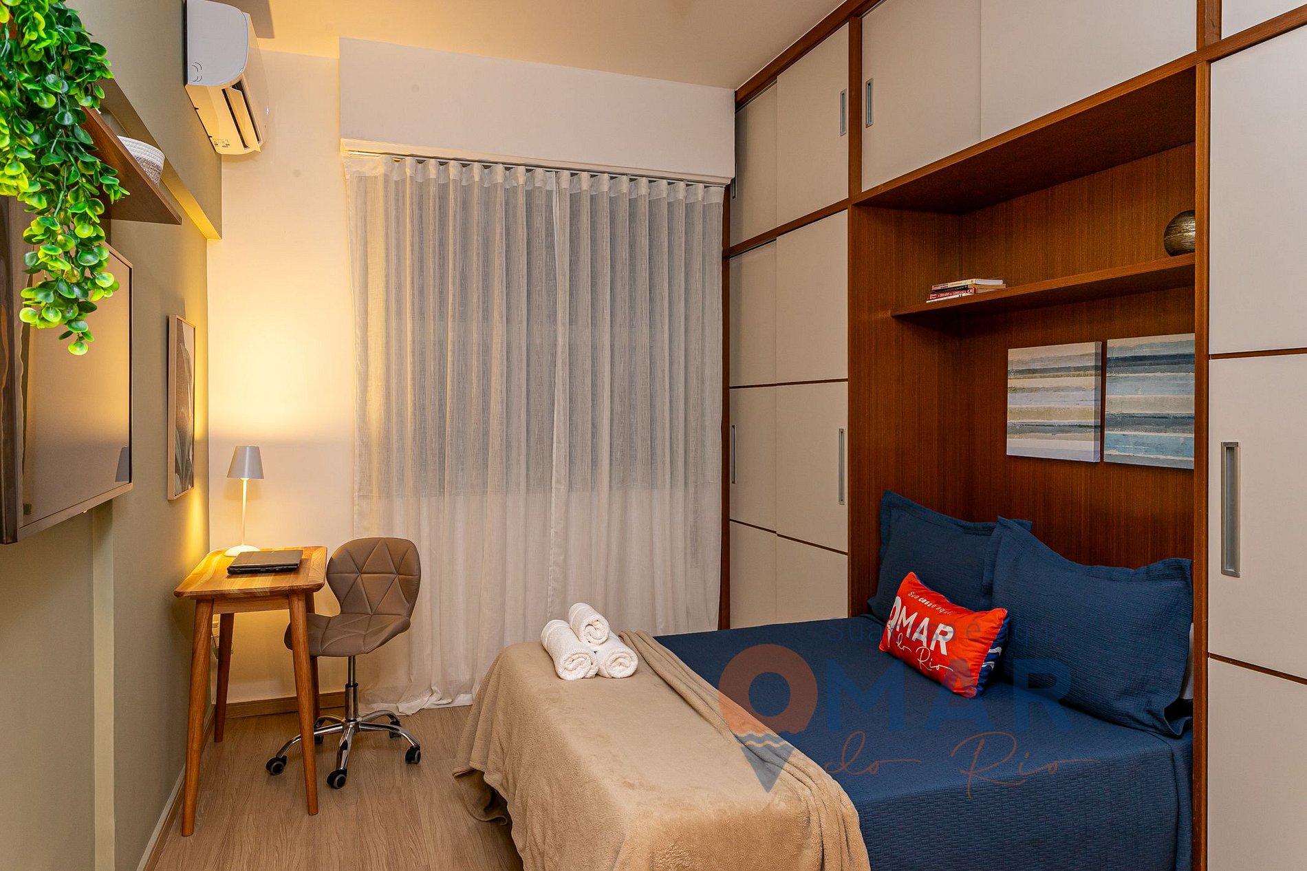 Quarto: Cama Casal (188cm x 138cm), Smart TV com canais abertos (antena digital), ar-condicionado split, workstation, poltrona, armário com cabides, cortina translúcida e veneziana externa blackout.