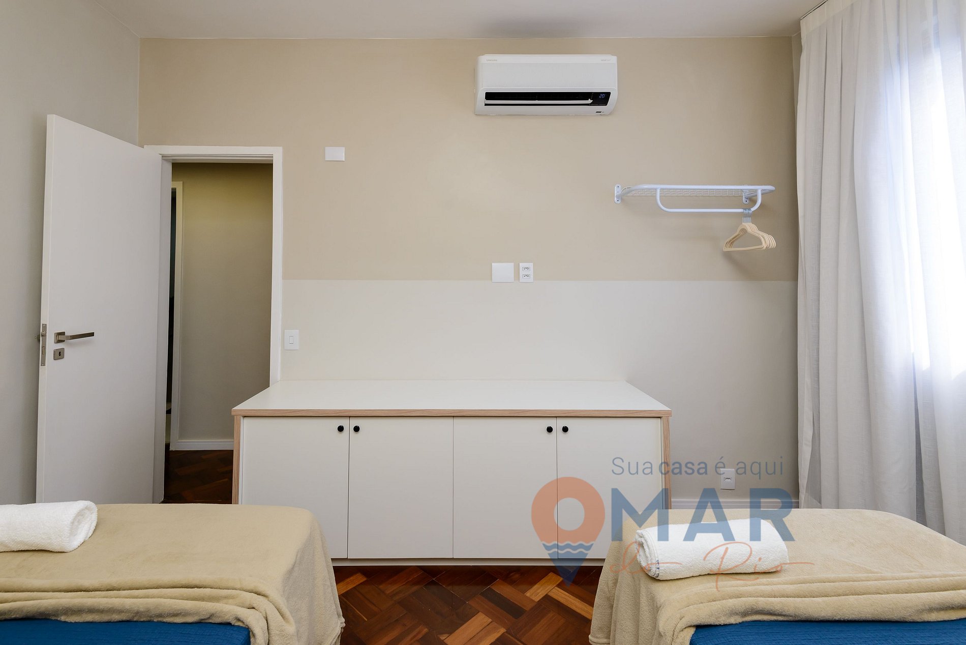 Quarto 3: duas camas de solteiro (188cm x 88cm) + duas camas auxiliares de solteiro, ar-condicionado split, arara com cabides, armário, cortinas translúcida e blackout.