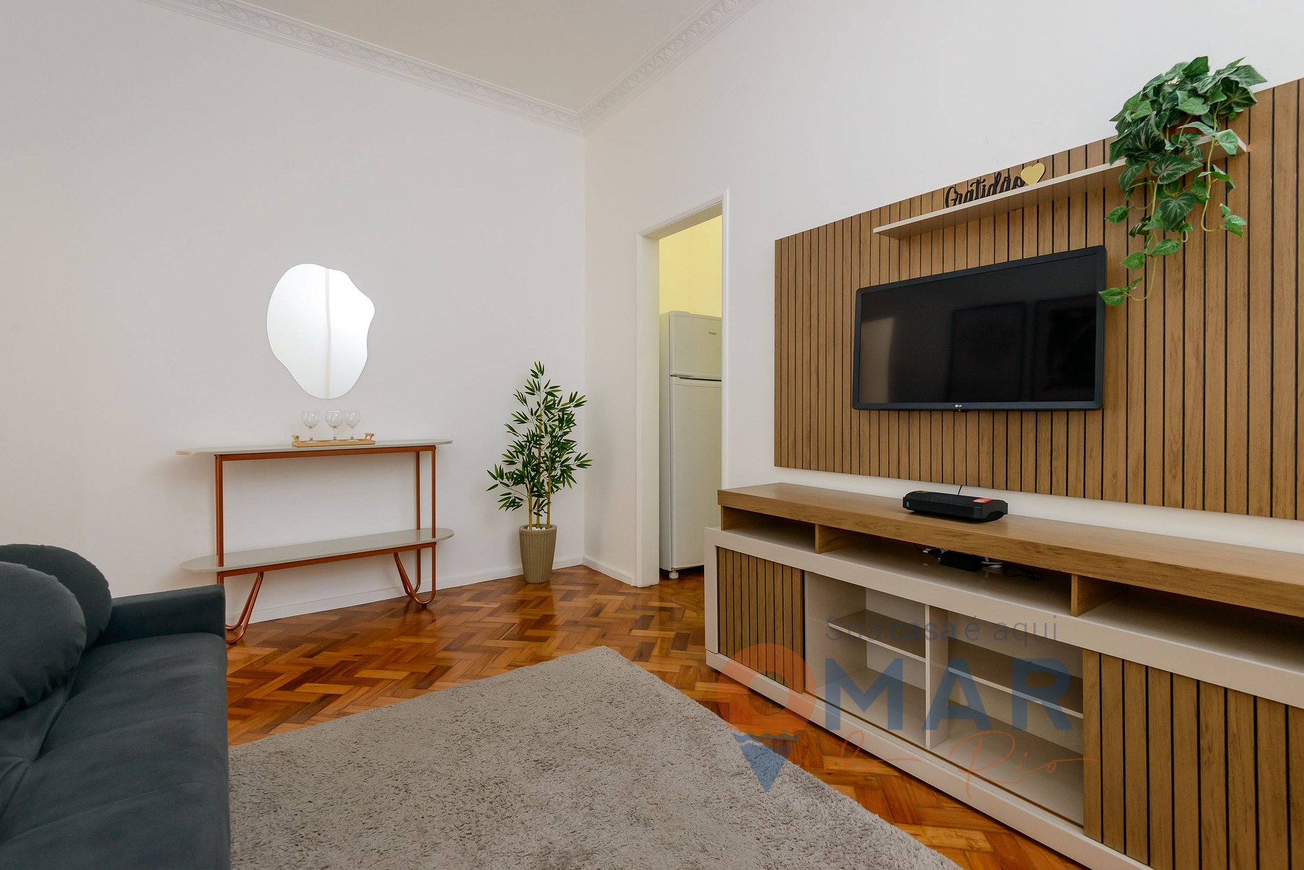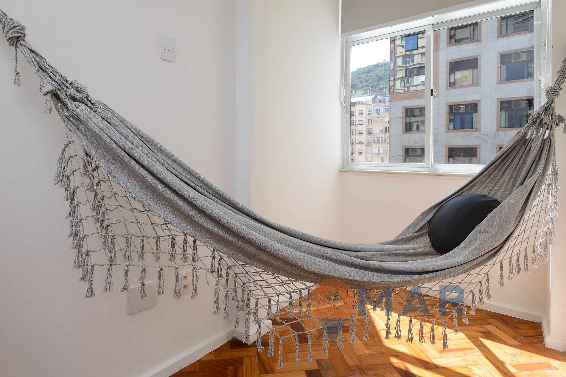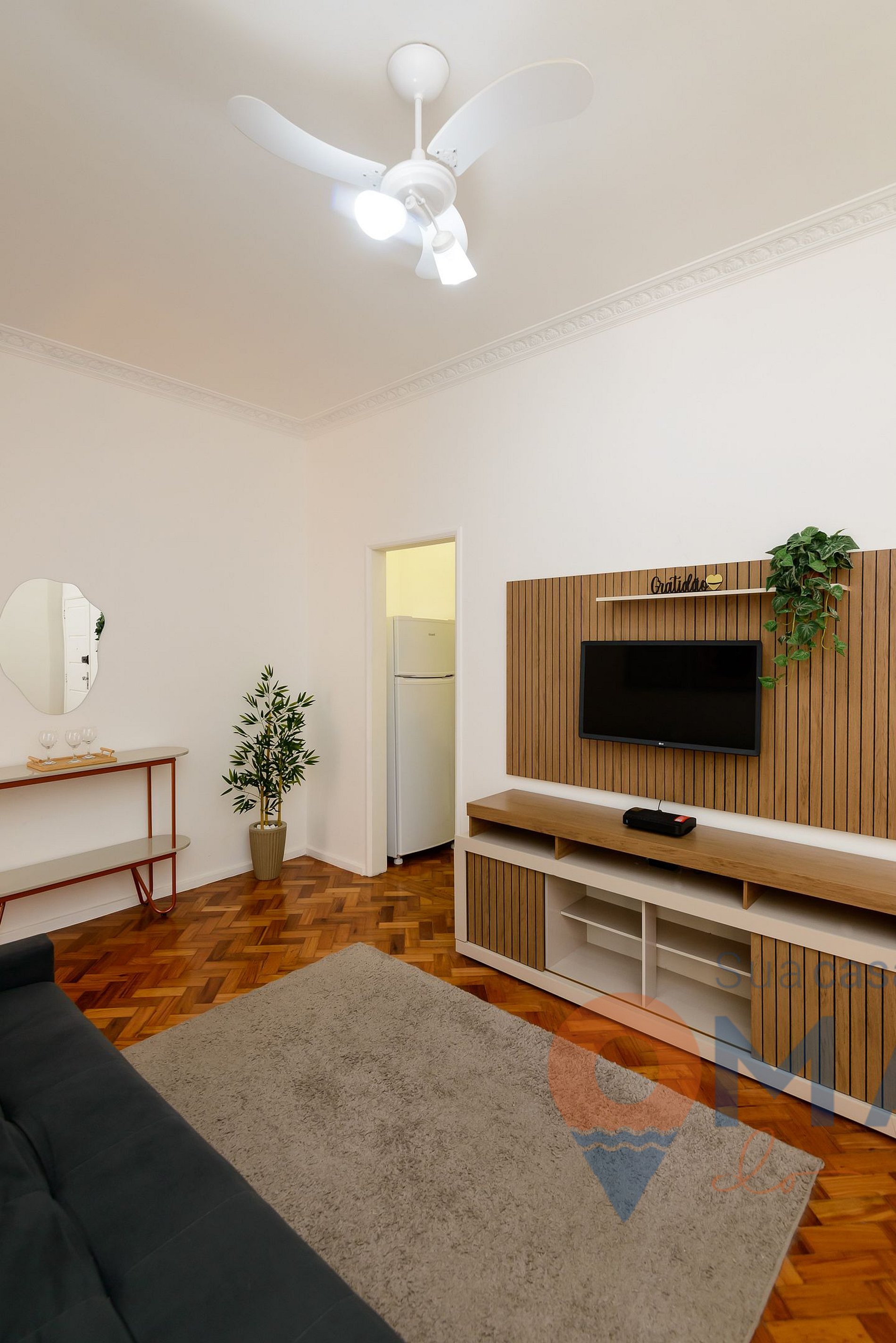 Sala: sofá com entrada USB e tipo C para carregar aparelhos eletrônicos, smat TV 32" com canais abertos (antena digital), mesa de jantar com assentos, ventilador de teto, rede de descanso, persiana blackout e espelho.