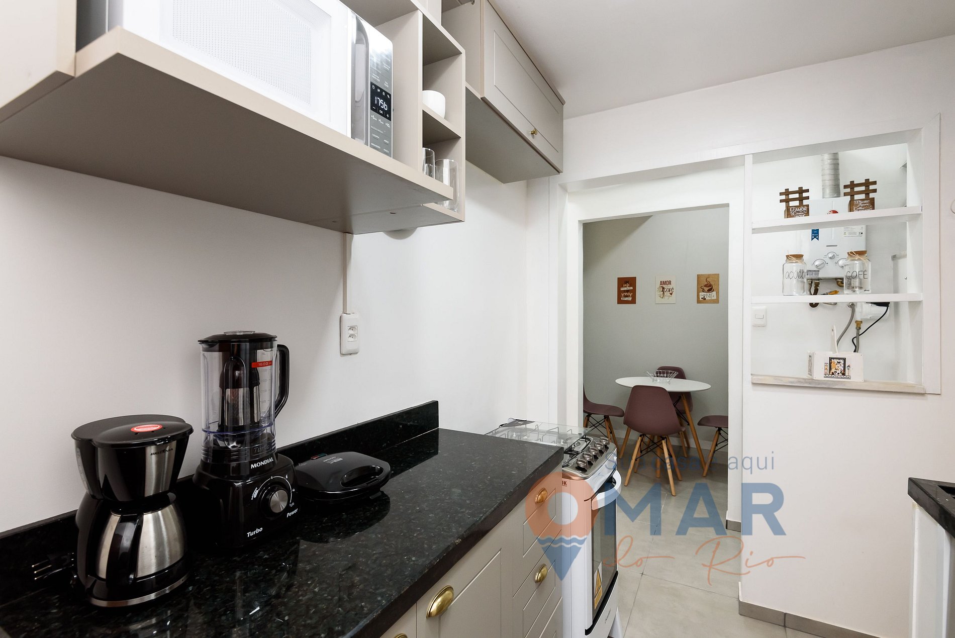 Cozinha: Fogão, geladeira, micro-ondas, máquina de café, mesa de jantar com cadeiras, liquidificador e itens de cozinha.