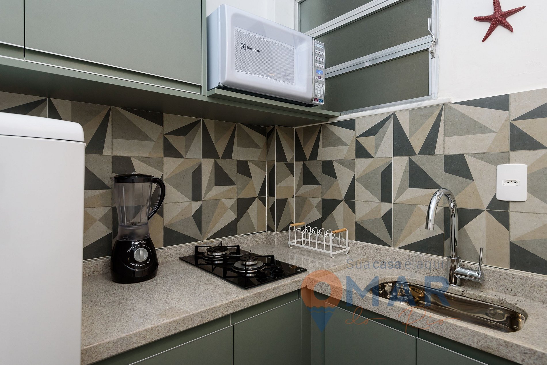 Cozinha: geladeira, fogão cooktop duas bocas, cafeteira Nespresso, liquidificador, micro-ondas.