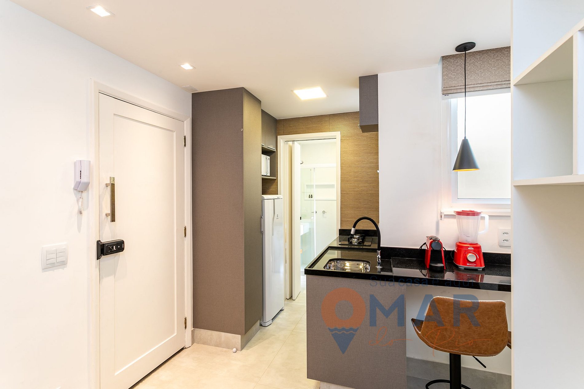 Estúdio: cama Queen Size (198cm x 158cm), ar-condicionado, Smart TV, canais a cabo pelo aplicativo Claro TV+ na televisão, armário fechado, sofá, bancada com banquetas e cortina blackout.