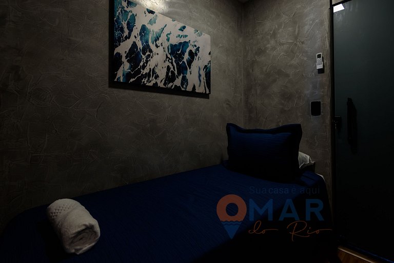 Suíte: cama de solteiro (188cm x 88cm), ar condicionado e arara de roupas