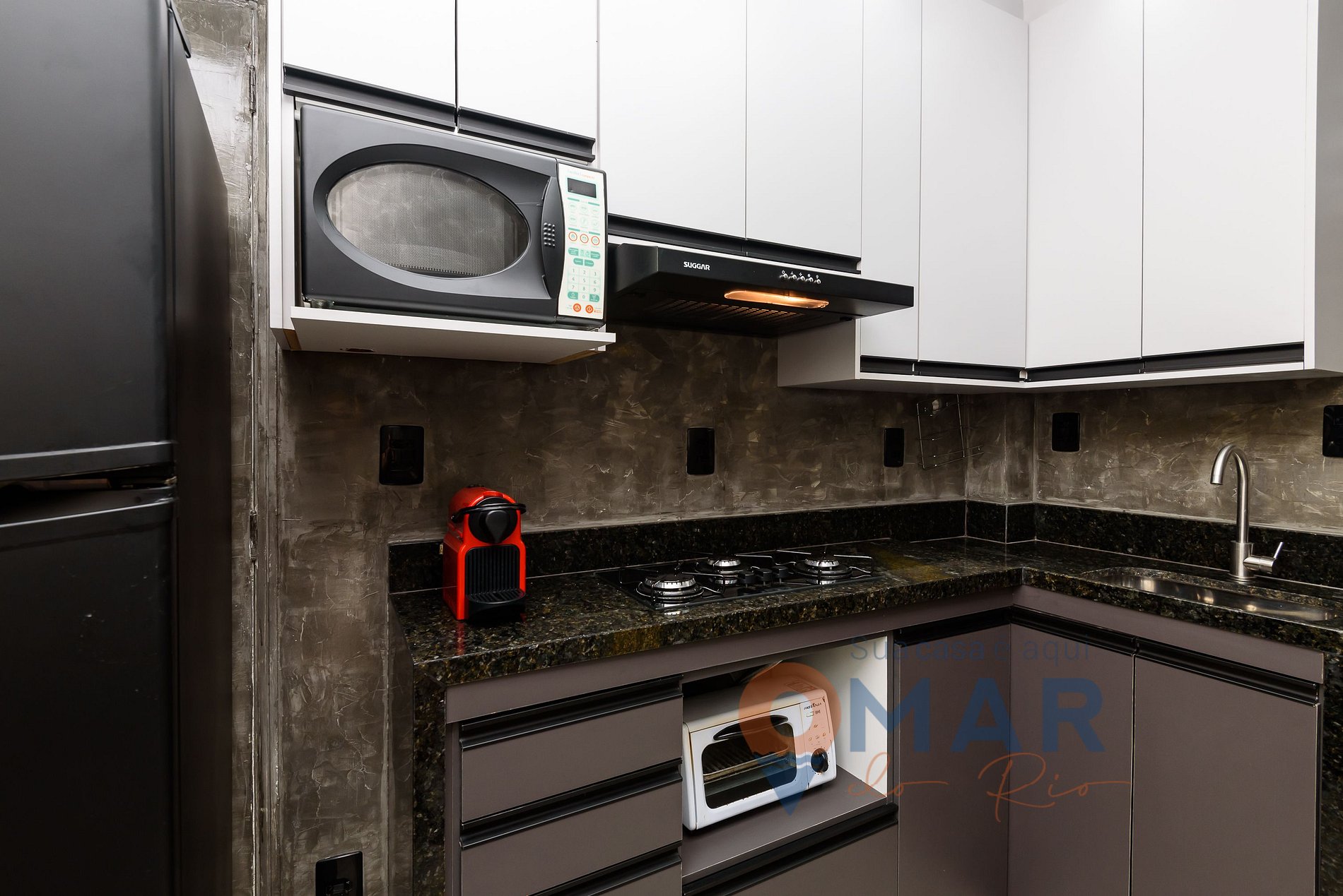 Cozinha: cooktop 3 bocas, geladeira, forno elétrico, micro-ondas, cafeteira Nespresso, mixer e utensílios.