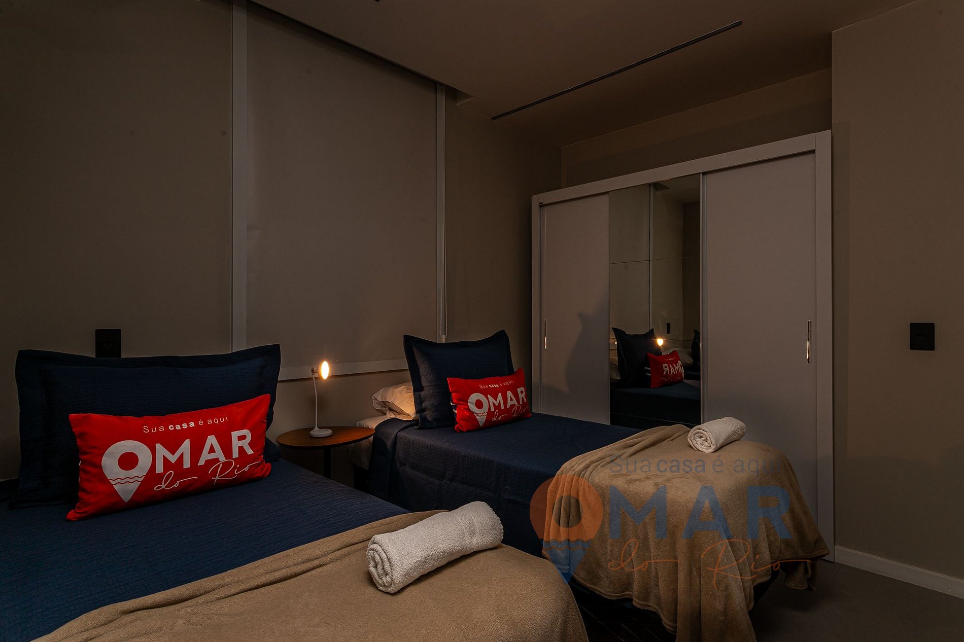 Quarto 2: 2 camas de solteiro (188cm x 88cm), ar-condicionado split, guarda-roupas com cabides, persiana blackout e tela de proteção.