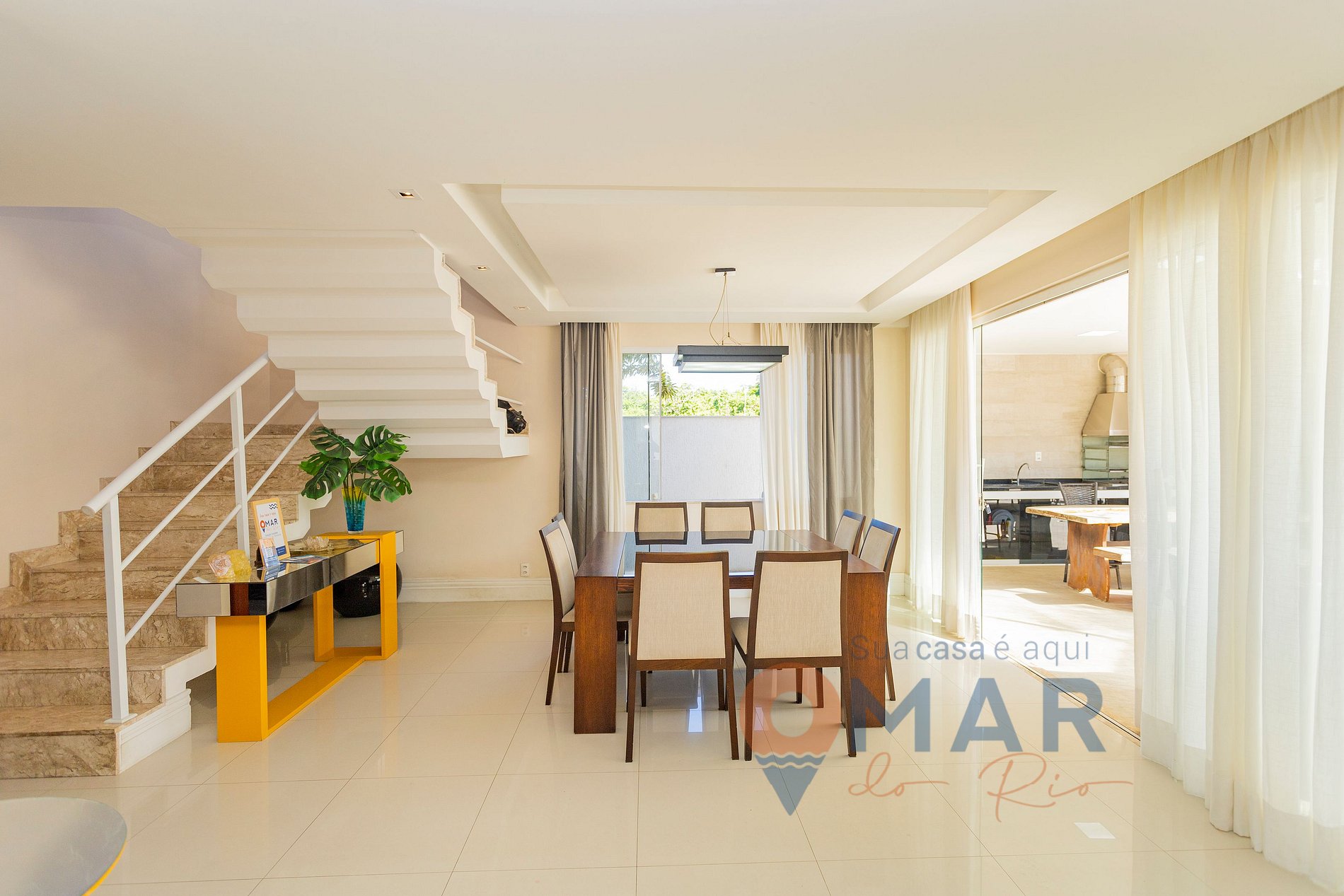 Sala (1º andar): sofá, poltronas, Smart TV 85", ventilador portátil, mesa de jantar com 8 cadeiras e cortina translúcida.