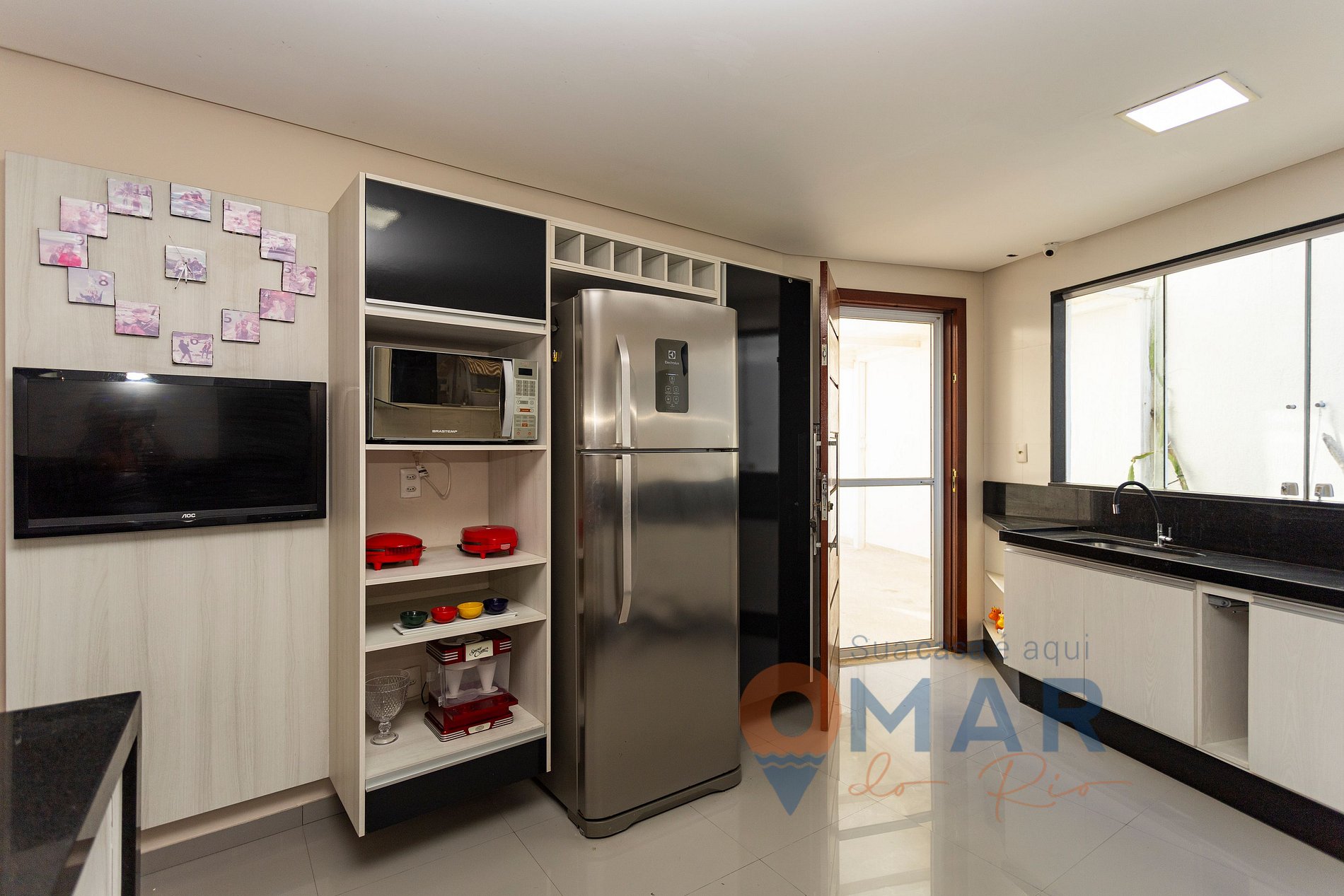 Cozinha: geladeira, fogão 5 bocas com forno, micro-ondas, air fryer, sanduicheira, omeleteira, espremedor de frutas, purificador de água com água natural, bancada com assentos, e utensílios para refeições e cozinhar.
