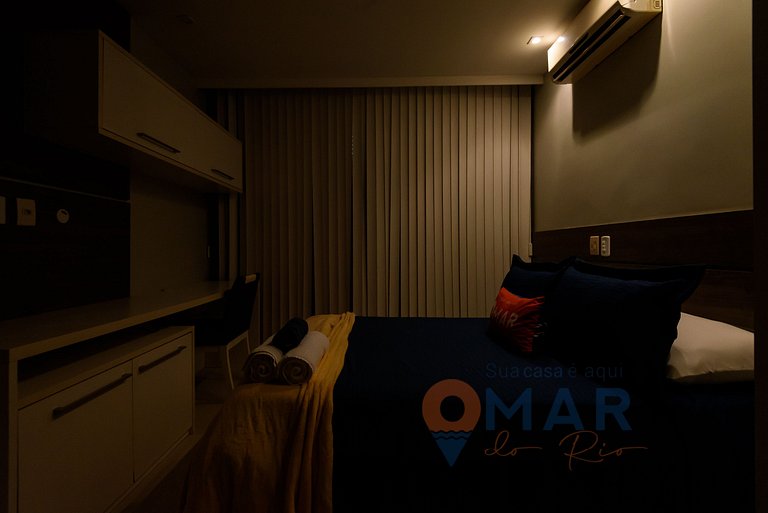 Quarto 1: cama Casal padrão (188cm x 138cm), ar condicionado, workstation, armário fechado e cortina.