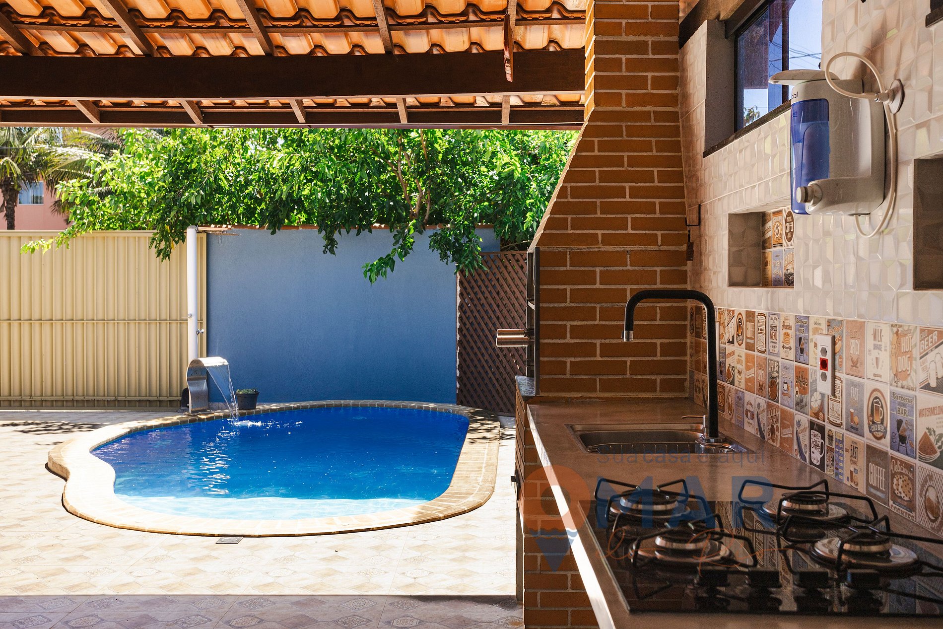 Área externa muito boa, com churrasqueira pia e fogão novinhos também. Além da piscina muito boa e um lavabo de apoio.