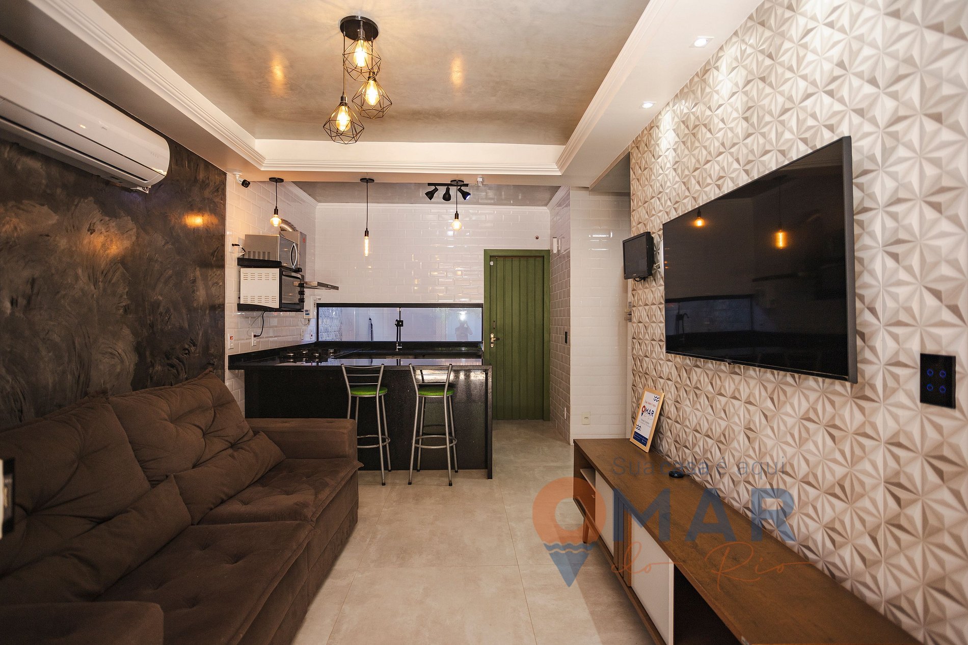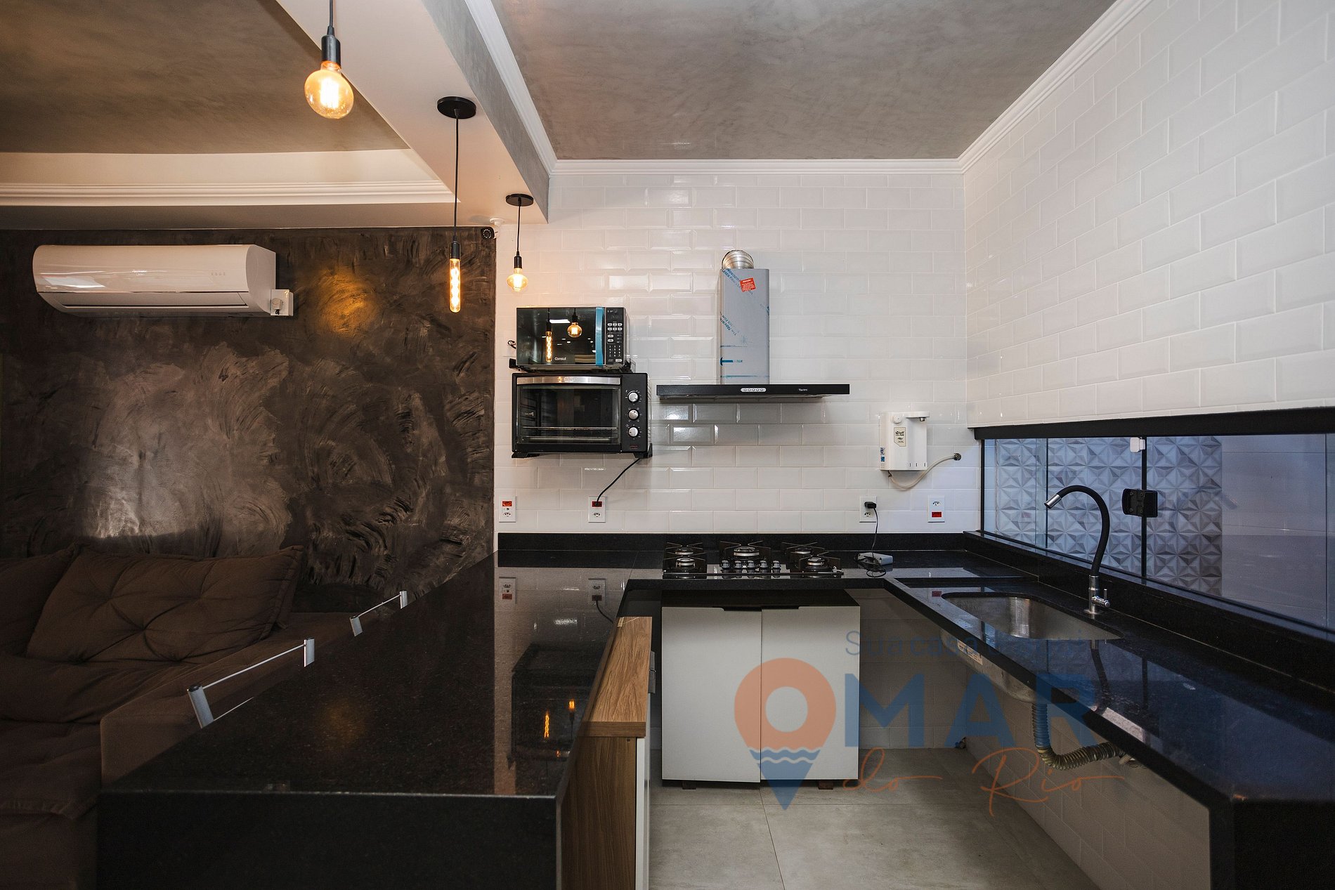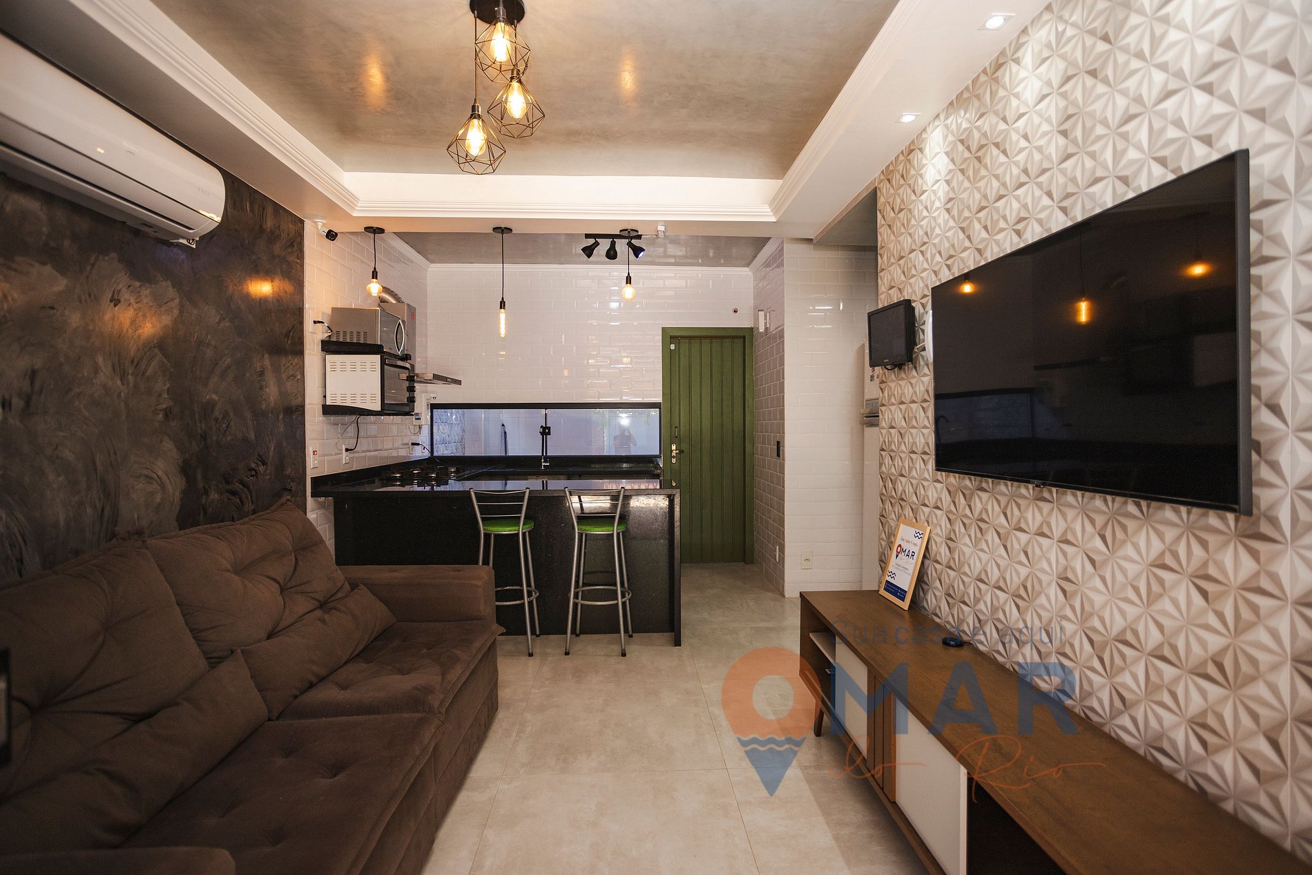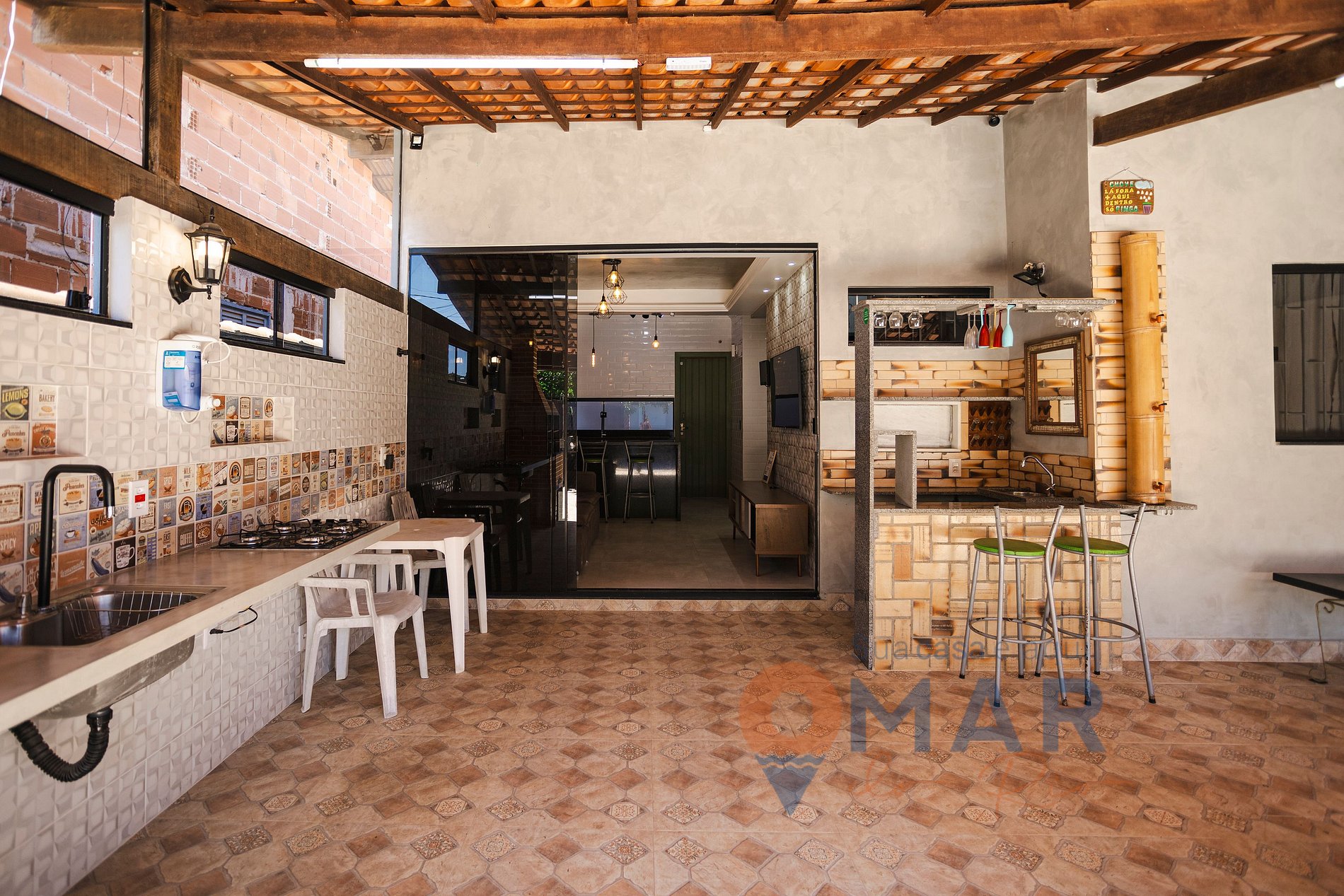 A casa é compacta, funcional e bem equipada, com ar condicionado e TV em todos os cômodos e uma cozinha completa.