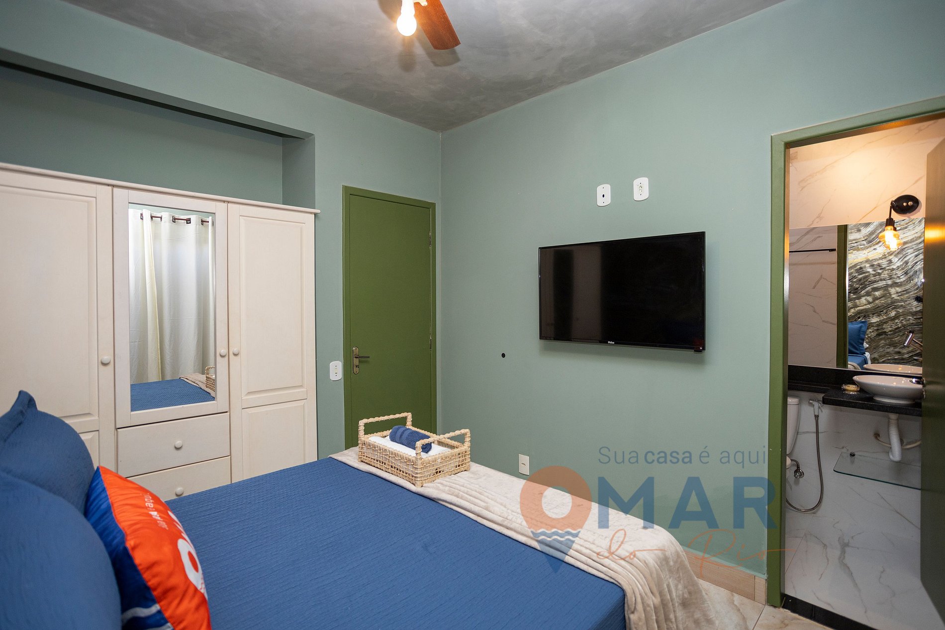 Suíte 2 (1º andar): Cama casal padrão (188cm x 138cm), Smart TV 32", ar-condicionado, ventilador de teto, guarda-roupas e cortina.