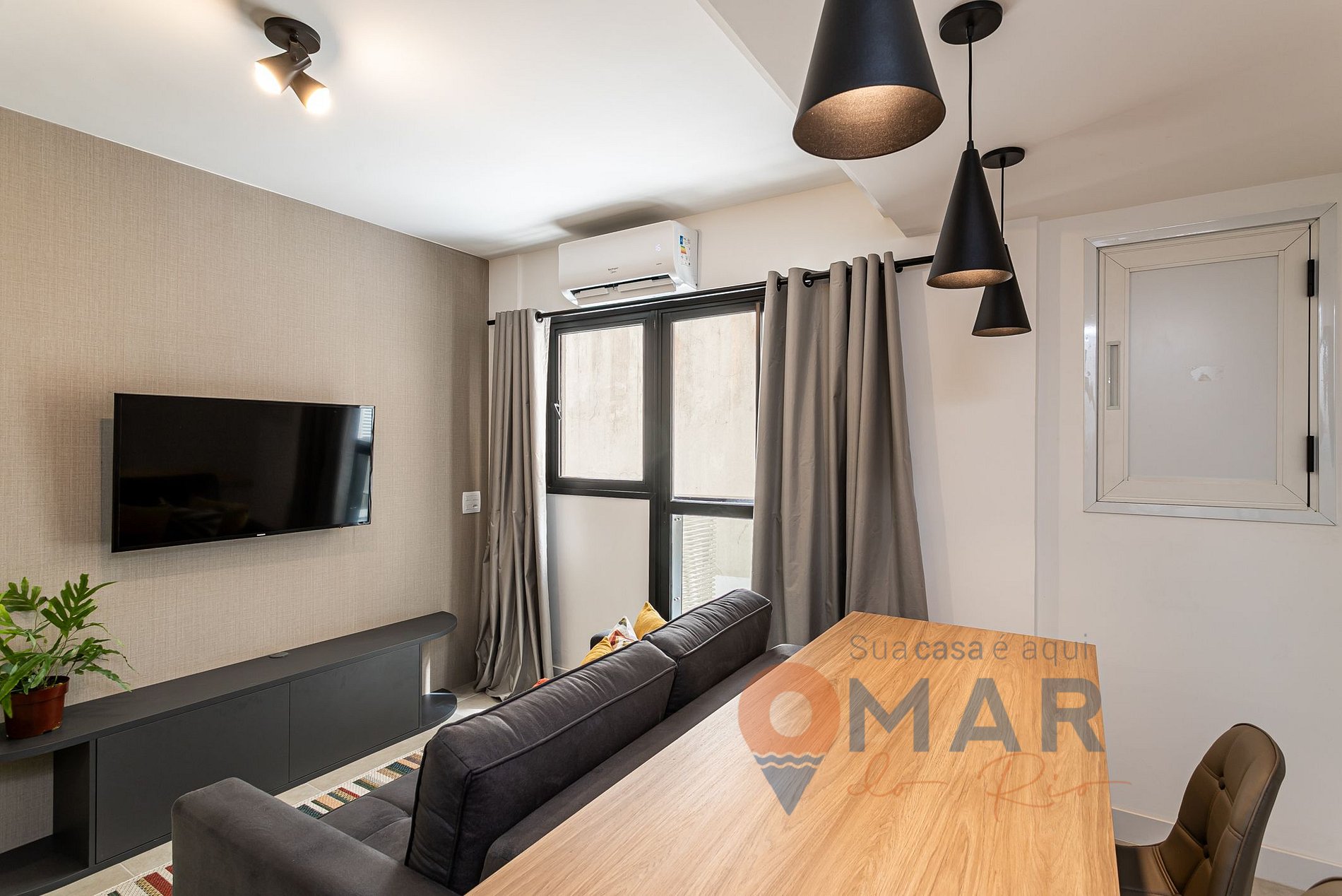 Sala: Sofá-cama (88x146x194 cm), ar-condicionado, Smart TV com canais, mesa de jantar + 4 cadeiras e cortina blackout.