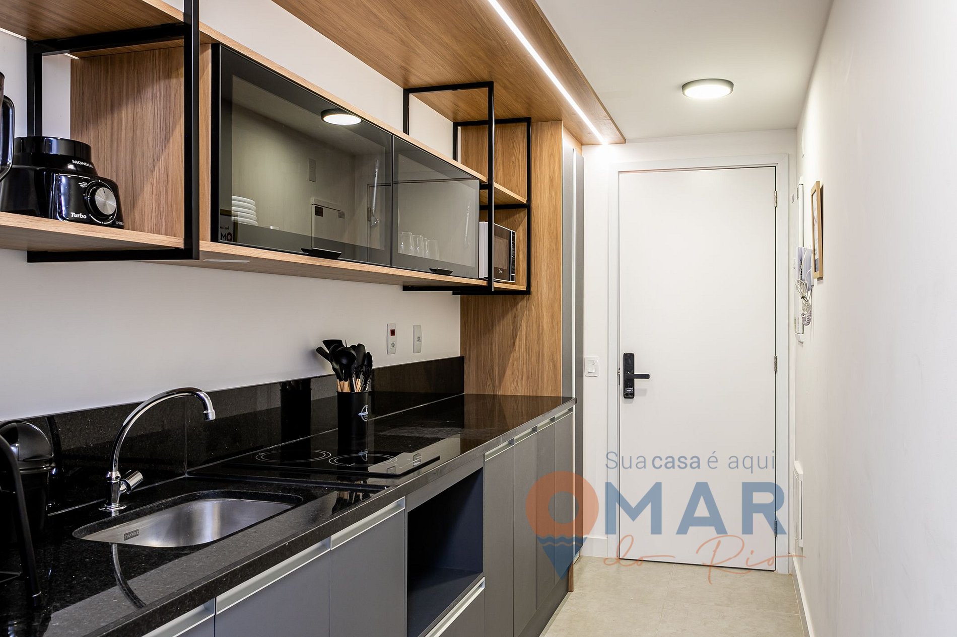 Cozinha: cooktop 2 bocas, geladeira, micro-ondas, cafeteira e liquidificador.