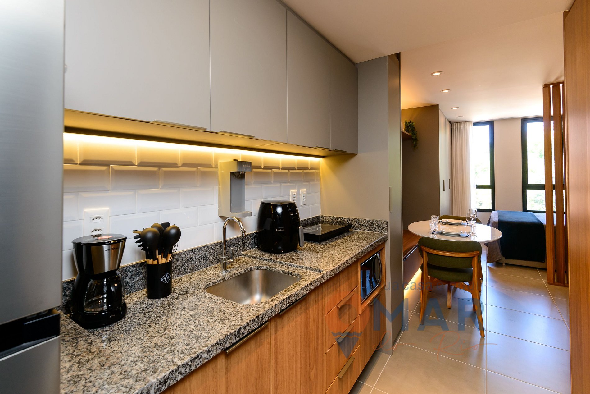 Estúdio: cama casal (188cm x 138cm), sofá, smart TV 43" com antena digital, ar-condicionado split, cortina blackout, armário com cabides e mesa de jantar com assentos.