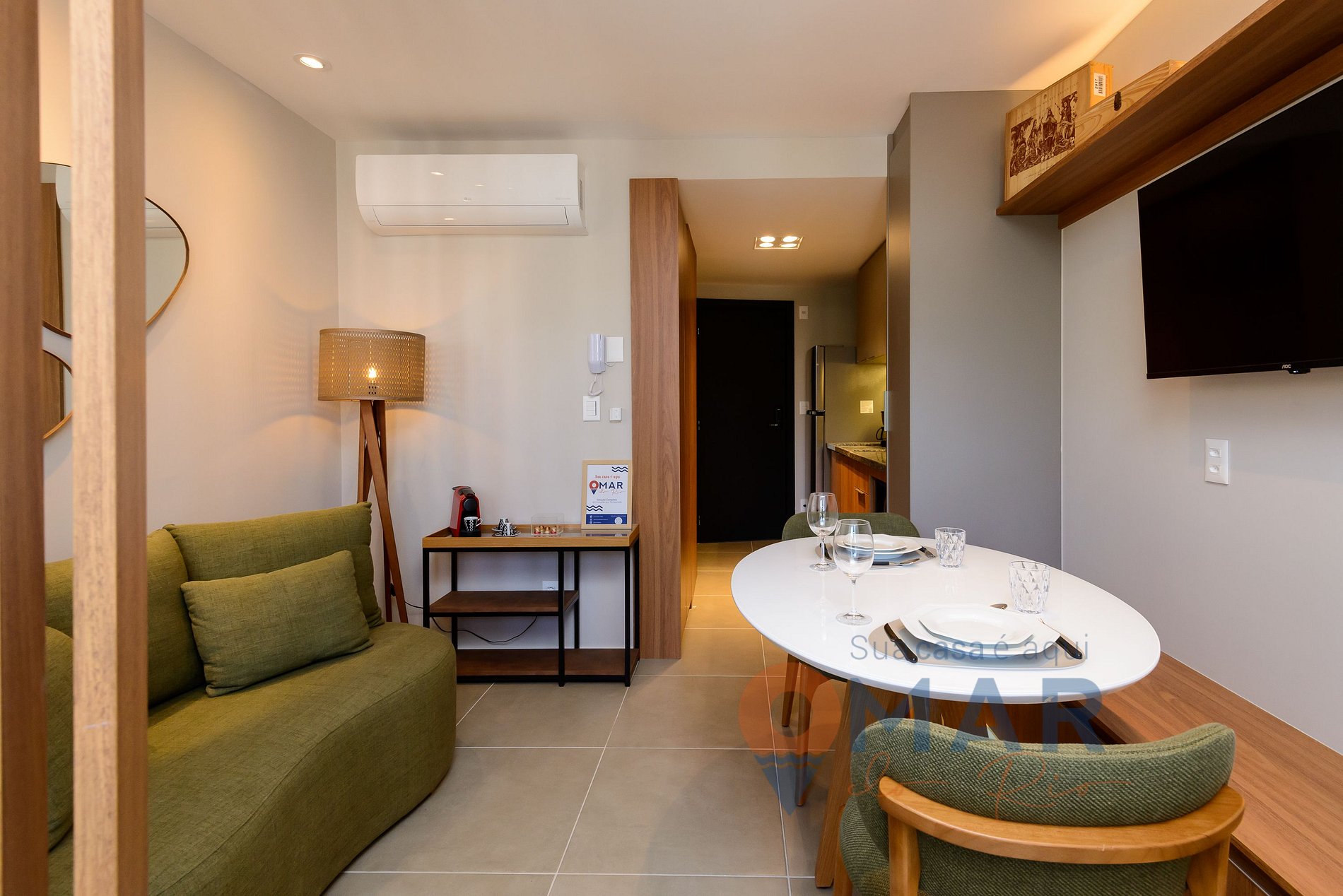 Estúdio: cama casal (188cm x 138cm), sofá, smart TV 43" com antena digital, ar-condicionado split, cortina blackout, armário com cabides e mesa de jantar com assentos.