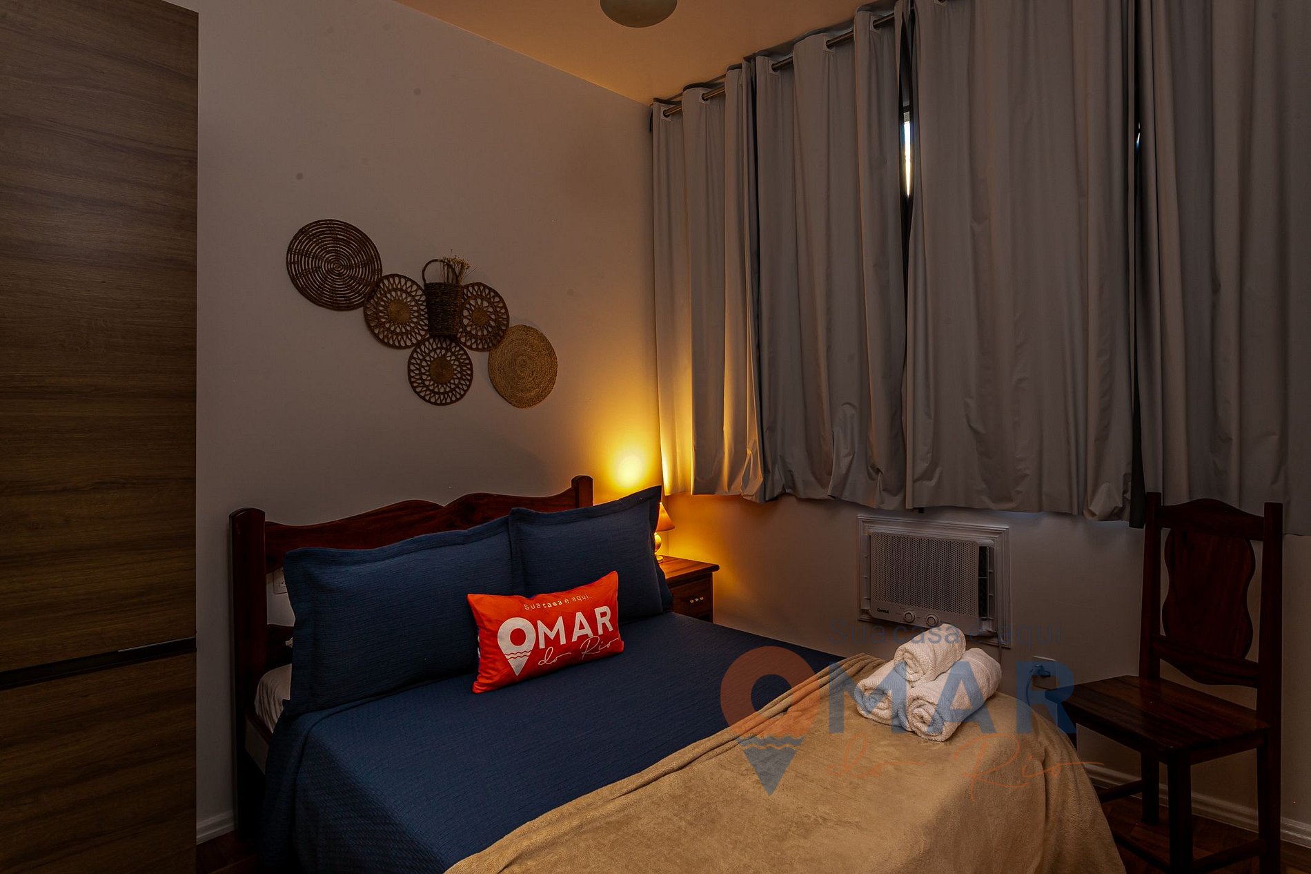 Quarto 1: cama Casal (188cm x 128cm), ar-condicionado, armário fechado, cabideiro, cadeira auxiliar e cortina blackout.
