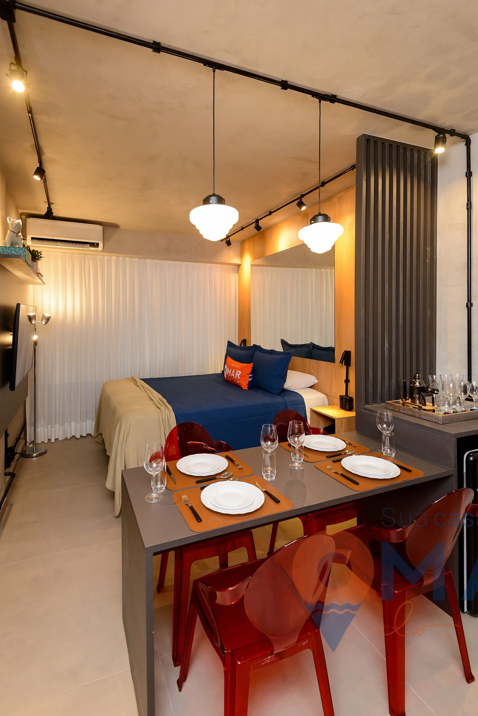 Studio: sofá-cama (140cm de largura X 183cm de comprimento), cama queen (198cm x 158cm), ar-condicionado, smart TV 50" com canais abertos (antena digital), armário aberto com cabides, persiana blackout e cortina translúcida.
