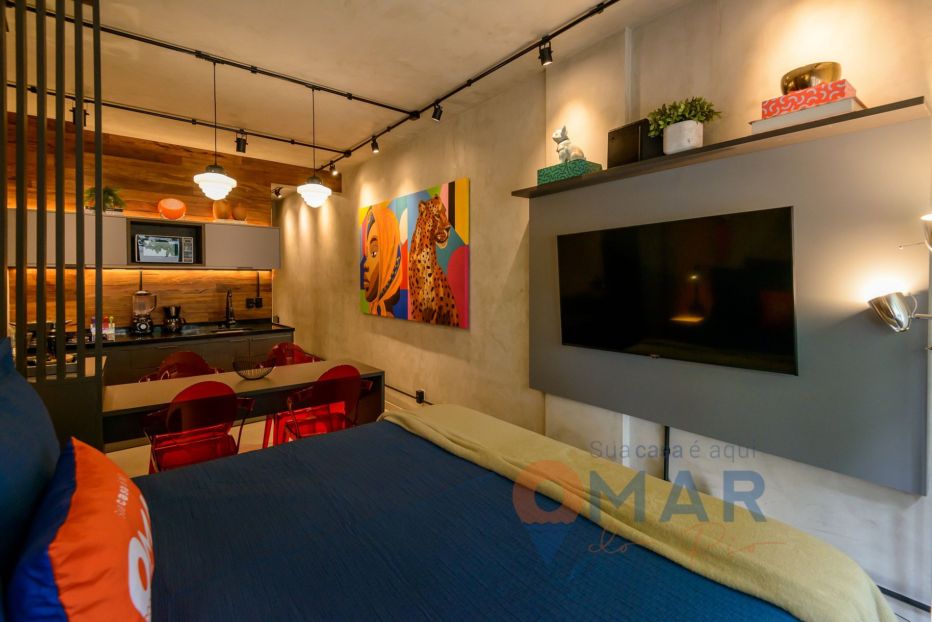 Studio: sofá-cama (140cm de largura X 183cm de comprimento), cama queen (198cm x 158cm), ar-condicionado, smart TV 50" com canais abertos (antena digital), armário aberto com cabides, persiana blackout e cortina translúcida.