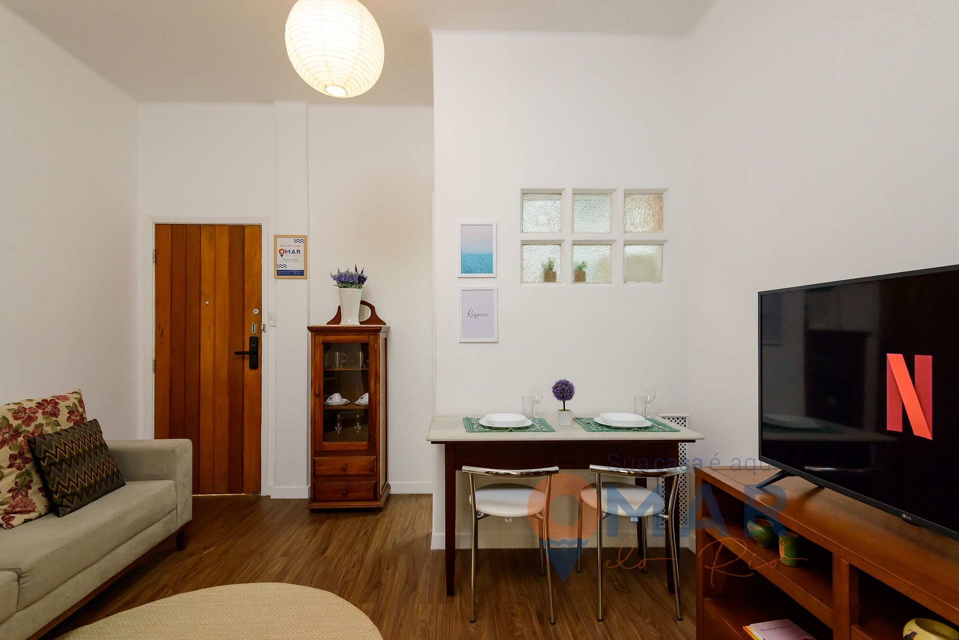 Sala: Sofá, Smart TV 43'' com canais aberto (antena digital) e mesa de jantar com duas cadeiras.