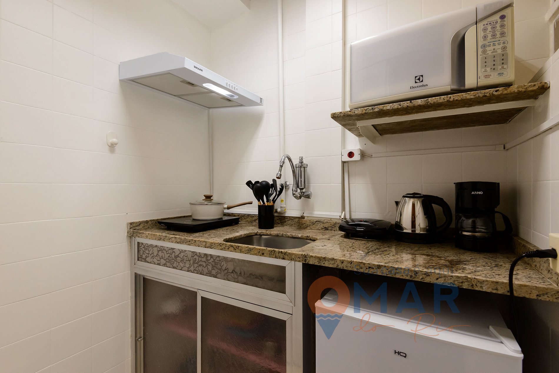 Cozinha: Frigobar, fogão cooktop de indução, micro-ondas, chaleira elétrica, liquidificador, sanduicheira, cafeteira e utensílios de cozinha.