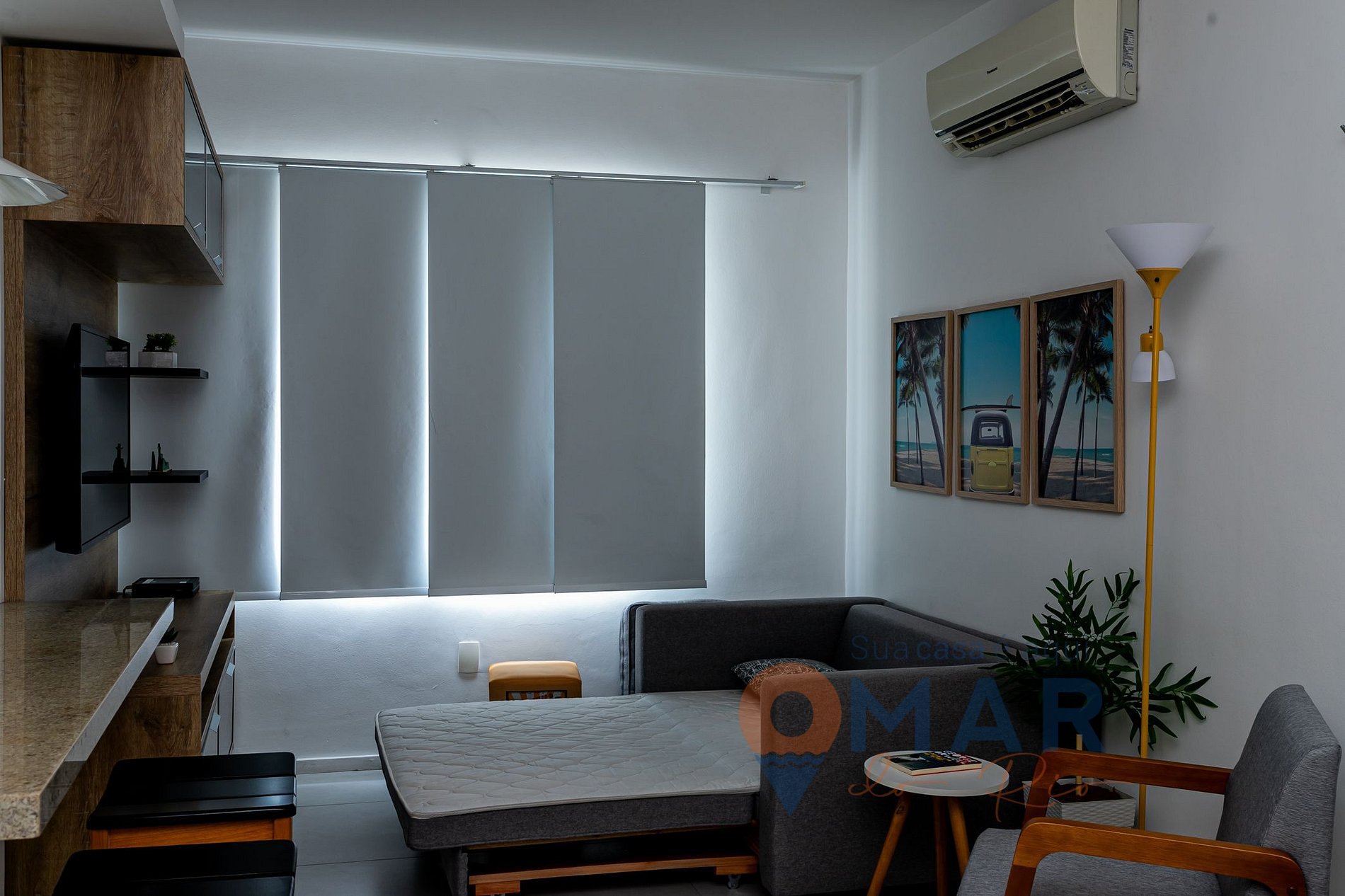 Sala: Sofá-cama (88x124x185cm), Smart TV com canais a cabo, ar condicionado, mesa de jantar + assentos e cortina blackout.