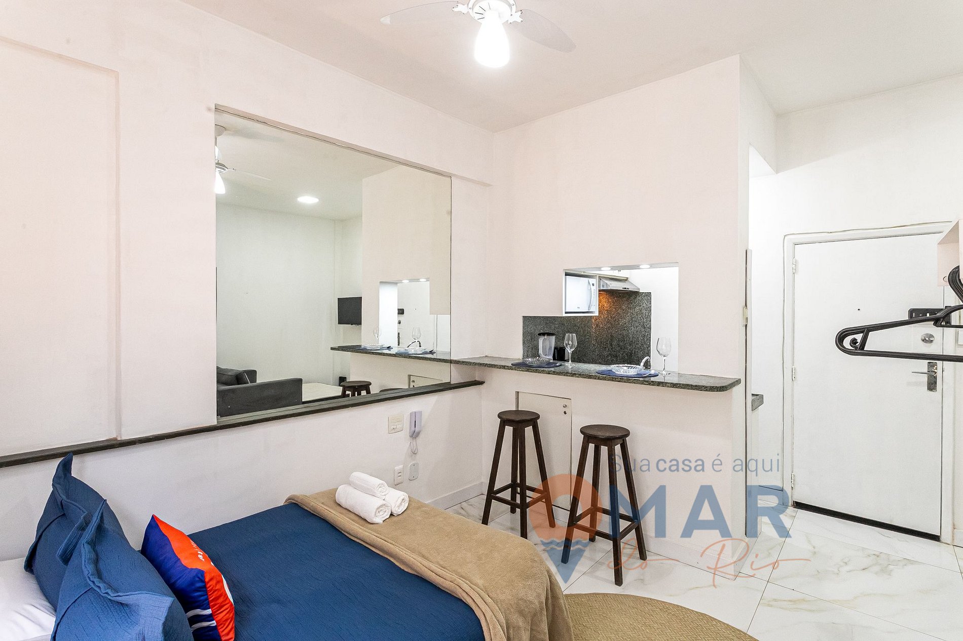 Estúdio: cama casal (188cm x 138cm), sofá, smart TV 33" com antena digital, ar-condicionado, cortina blackout, espelho de corpo inteiro, arara com cabides, maleiro, espaço de jantar com bancada e banquetas.