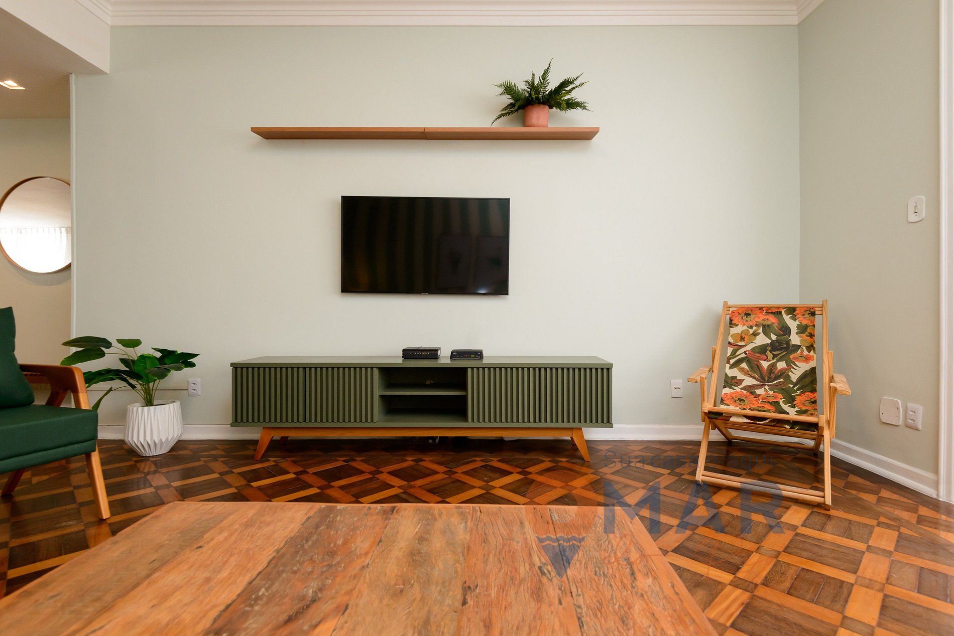 Sala de TV: Sofá, Smart TV 50'', itens decorativos, ar-condicionado split, espelho, mesa de centro e poltronas.